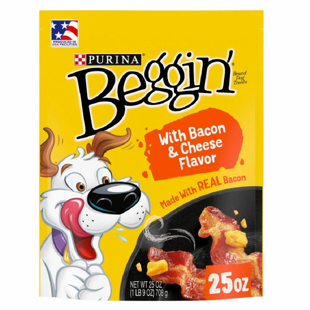 Get a little cheesy with your pooch when you hand over Purina Beggin’ Strips With Bacon and Cheese Flavor Adult Dog Treats. Every meaty, cheesy mouthful of yum is made with real bacon and the taste of cheese for a true snack sensation. Real meat is the #1 ingredient in these bacon flavored dog treats. Plus, the tender texture is easy to chew. Toss your furry friend a whole dog strip as an irresistible snack between meals. Or tear each soft dog treat into smaller pieces for a reward so yummy, it’s worth behaving for. With the aroma and shape of real bacon, these Beggin’ bacon flavor strips with cheese convince dogs they’re getting bacon fried up just for them. Because these bacon and cheese flavor dog snacks contain no artificial flavors or FD&C colors, your pup gets the bacon taste he loves along with the wholesome ingredients you want for him.