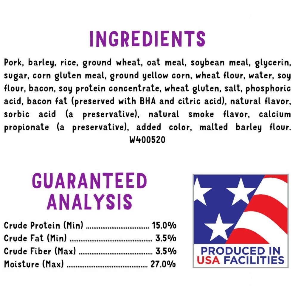 Pork, Barley, Rice, Ground Wheat, Oat Meal, Soybean Meal, Glycerin, Sugar, Corn Gluten Meal, Ground Yellow Corn, Wheat Flour, Water, Soy Flour, Bacon, Soy Protein Concentrate, Wheat Gluten, Salt, Phosphoric Acid, Bacon Fat (Preserved With BHA And Citric Acid), Natural Flavor, Sorbic Acid (A Preservative), Natural Smoke Flavor, Calcium Propionate (A Preservative), Added Color, Malted Barley Flour. W400520.