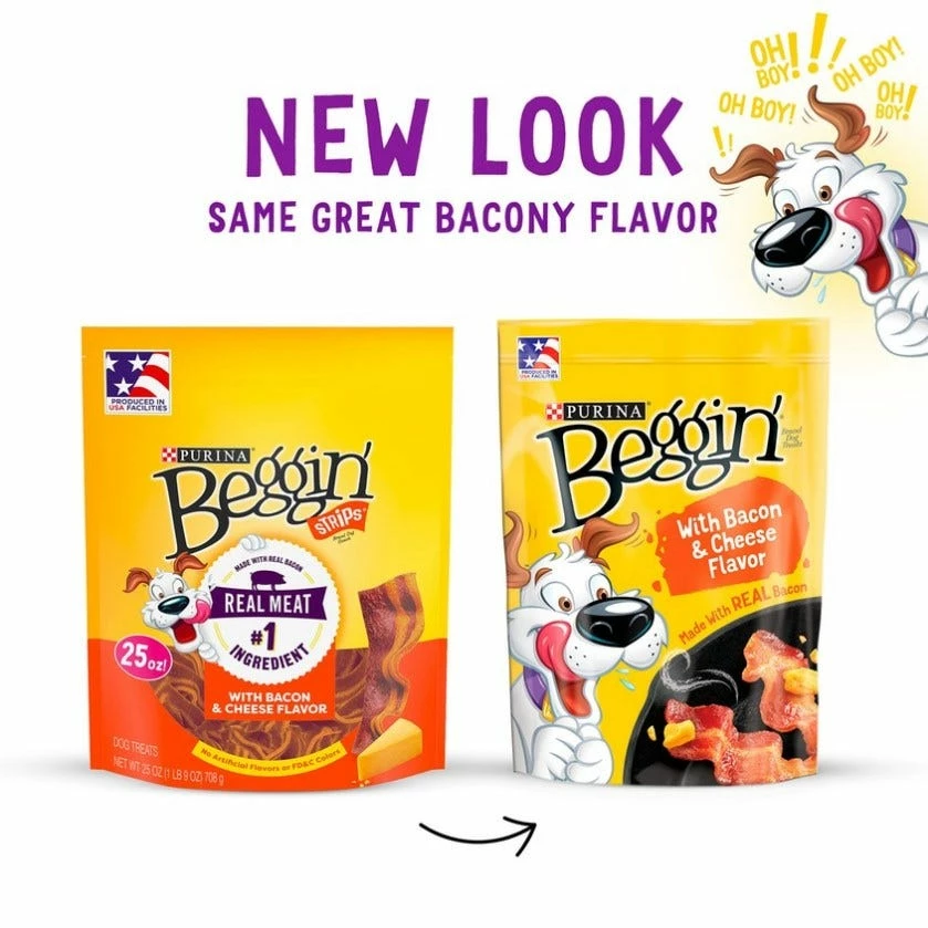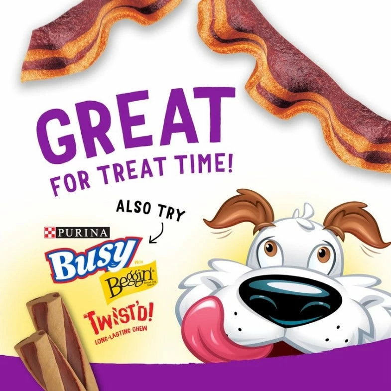 Unleash the bacony madness with the flavor of Purina Beggin’ Strips With Bacon & Cheese Flavor adult dog treats. Each treat is a meaty, cheesy mouthful of yum that’s made with real bacon and the taste of cheese to drive your dog wild with excitement. Real meat is the #1 ingredient for mouthwatering goodness in every bite. Hand over a whole strip as an irresistible snack between meals, or tear each strip into smaller pieces for a reward so yummy, it’s worth behaving for. With the aroma and shape of real bacon, these Beggin’ bacon flavor strips with cheese convince dogs they’re getting bacon fried up just for them. Plus, unlike some dog chew treats, these soft dog strips have a tender texture that’s easy for dogs to scarf down. Because these bacon and cheese flavor snacks for dogs contain no artificial flavors or FD&C colors, your dog gets the bacon taste he loves along with only the real ingredients you want for him. Get a little cheesy with your dog when you offer him one of these delicious Purina Beggin’ Strips dog treats.
