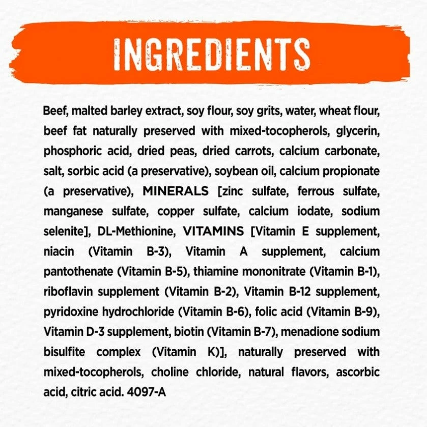 Beef, Malted Barley Extract, Soy Flour, Soy Grits, Water, Wheat Flour, Beef Fat Naturally Preserved with Mixed-Tocopherols, Glycerin, Phosphoric Acid, Dried Peas, Dried Carrots, Calcium Carbonate, Salt, Sorbic Acid (a Preservative), Soybean Oil, Calcium Propionate (a Preservative), Minerals [Zinc Sulfate, Ferrous Sulfate, Manganese Sulfate, Copper Sulfate, Calcium Iodate, Sodium Selenite], DL-Methionine, Vitamins [Vitamin E Supplement, Niacin (Vitamin B-3), Vitamin A Supplement, Calcium Pantothenate (Vitamin B-5), Thiamine Mononitrate (Vitamin B-1), Riboflavin Supplement (Vitamin B-2), Vitamin B-12 Supplement, Pyridoxine Hydrochloride (Vitamin B-6), Folic Acid (Vitamin B-9), Vitamin D-3 Supplement, Biotin (Vitamin B-7), Menadione Sodium Bisulfite Complex (Vitamin K)], Naturally Preserved with Mixed-Tocopherols, Choline Chloride, Natural Flavors, Ascorbic Acid, Citric Acid. 4097-A.