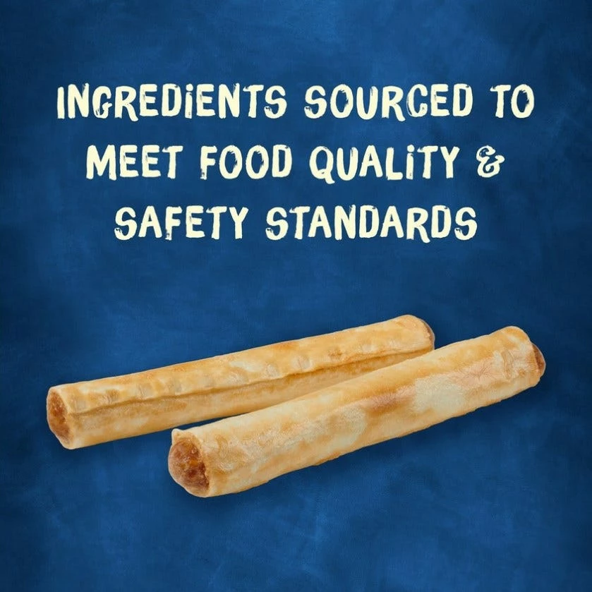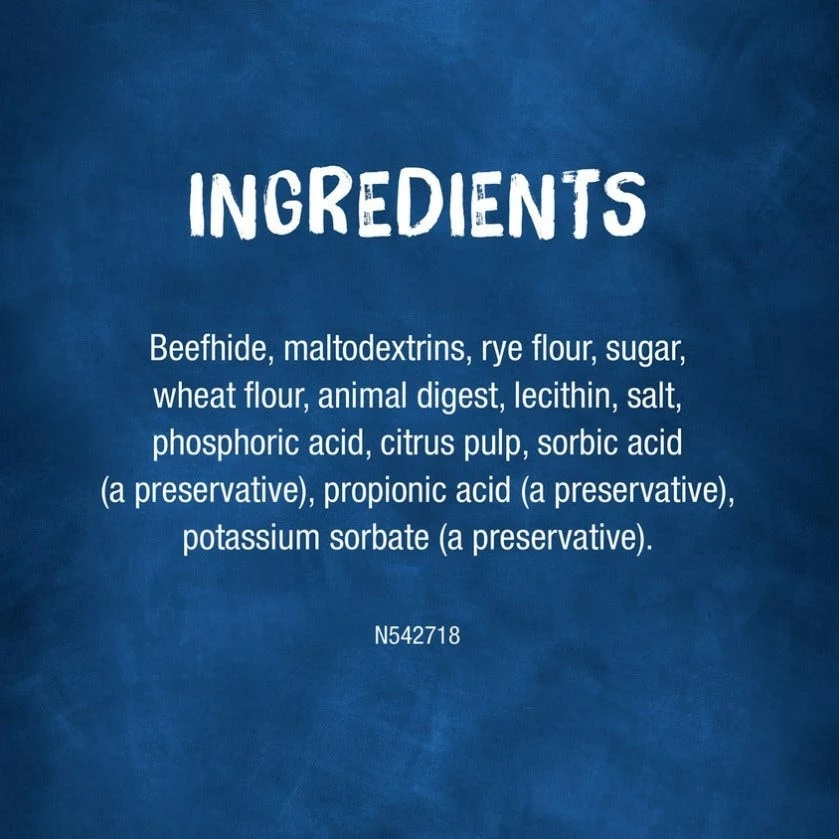 Beef Hide, Rye Flour, Maltodextrins, Sugar, Animal Digest, Wheat Flour, Lecithin, Salt, Phosphoric Acid, Sorbic Acid (a Preservative), Citrus Fiber, Propionic Acid (a Preservative), Potassium Sorbate (a Preservative).