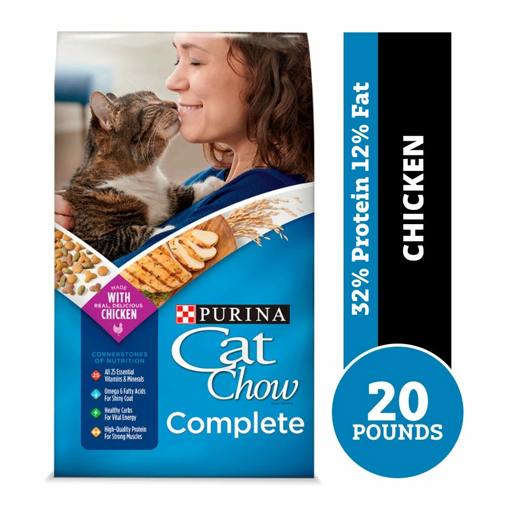 Support your kitty from nose to tail with Purina Cat Chow Complete Dry Cat Food. Packed with yum, this high protein dry cat food is made with real, farm-raised chicken and loaded with high-quality protein to support your good girl’s strong muscles. Plus, it has healthy carbs for vital energy and omega-6 fatty acids to help promote her shiny coat. Even better, this Cat Chow cat food is made to support your kitty from her playful kitten days all the way through adulthood, giving her the 100% complete and balanced nutrition she needs at every stage of life. 25 essential vitamins and minerals support her overall health and are paired with wholesome ingredients. Give your kitty the four cornerstones of nutrition at every feeding: high-quality protein, healthy carbs, essential fatty acids, and essential vitamins and minerals! With cat-approved goodness, this Purina Cat Chow dry cat food provides nutrition to make every moment complete for cats to live their best and brightest.