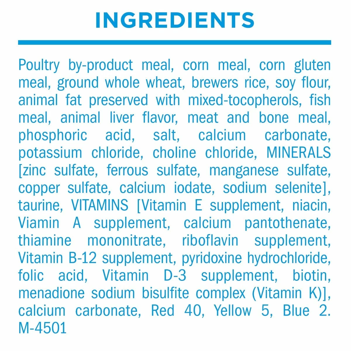 Chicken By-Product Meal, Ground Yellow Corn, Corn Gluten Meal, Whole Grain Wheat, Rice, Soy Flour, Beef Fat Preserved With Mixed-Tocopherols, Chicken, Fish Meal, Liver Flavor, Phosphoric Acid, Calcium Carbonate, Salt, Potassium Chloride, Choline Chloride, Minerals [Zinc Sulfate, Ferrous Sulfate, Manganese Sulfate, Copper Sulfate, Calcium Iodate, Sodium Selenite], Taurine, Vitamins [Vitamin E Supplement, Niacin (Vitamin B-3), Vitamin A Supplement, Calcium Pantothenate (Vitamin B-5), Thiamine Mononitrate (Vitamin B-1), Riboflavin Supplement (Vitamin B-2), Vitamin B-12 Supplement, Pyridoxine Hydrochloride (Vitamin B-6), Folic Acid (Vitamin B-9), Vitamin D-3 Supplement, Biotin (Vitamin B-7), Menadione Sodium Bisulfite Complex (Vitamin K)], Dl-Methionine, Red 40, Yellow 5, Blue 2. N450118.