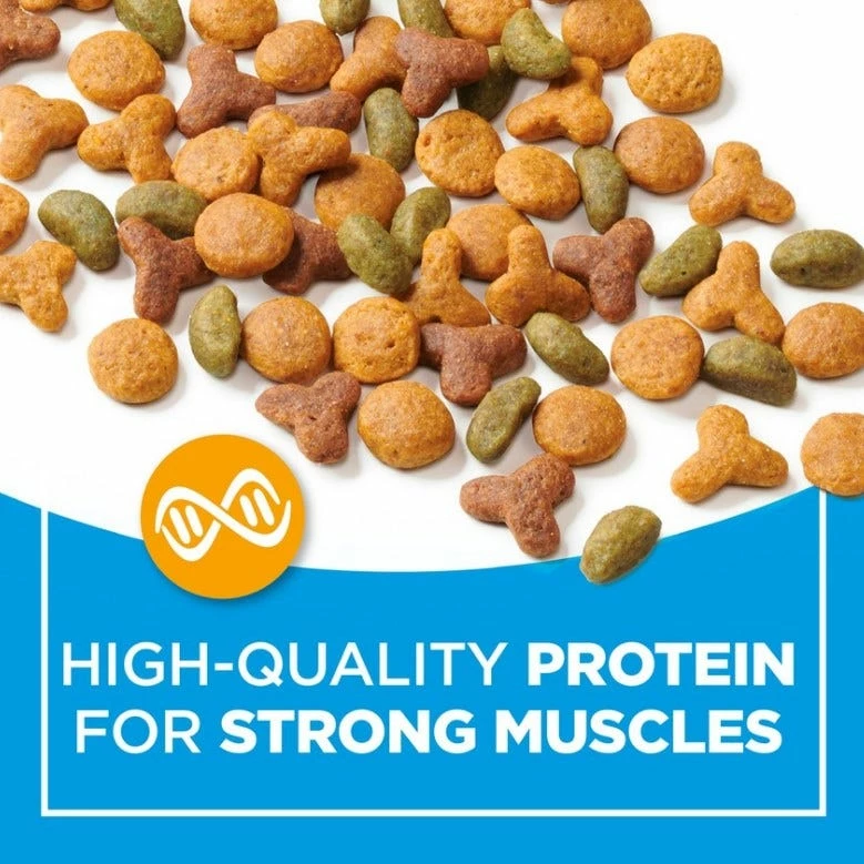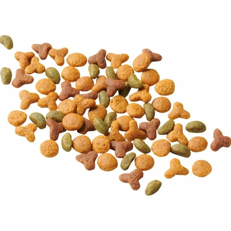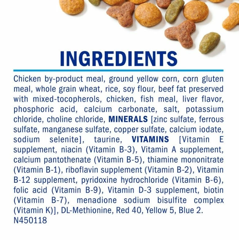 Chicken by-product meal, ground yellow corn, corn gluten meal, whole grain wheat, rice, soy flour, beef fat preserved with mixed-tocopherols, chicken, fish meal, liver flavor, phosphoric acid, calcium carbonate, salt, potassium chloride, choline chloride, MINERALS [zinc sulfate, ferrous sulfate, manganese sulfate, copper sulfate, calcium iodate, sodium selenite], taurine, VITAMINS [Vitamin E supplement, niacin (Vitamin B-3), Vitamin A supplement, calcium pantothenate (Vitamin B-5), thiamine mononitrate (Vitamin B-1), riboflavin supplement (Vitamin B-2), Vitamin B-12 supplement, pyridoxine hydrochloride (Vitamin B-6), folic acid (Vitamin B-9), Vitamin D-3 supplement, biotin (Vitamin B-7), menadione sodium bisulfite complex (Vitamin K)], DL-Methionine, Red 40, Yellow 5, Blue 2. N450118