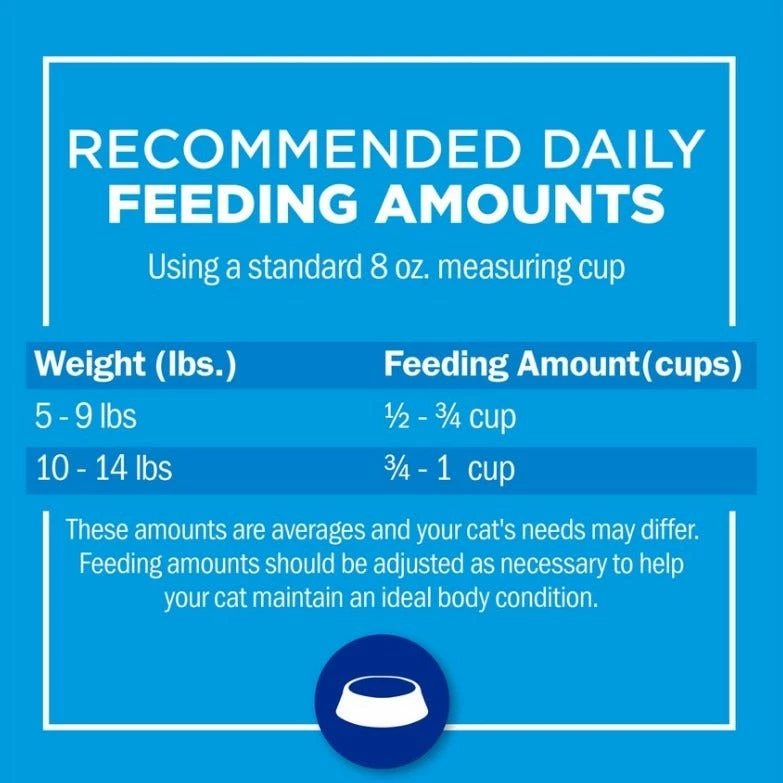 These amounts are averages and your cat’s needs may differ. Feeding amounts should be adjusted as necessary to help your cat maintain an ideal body condition.