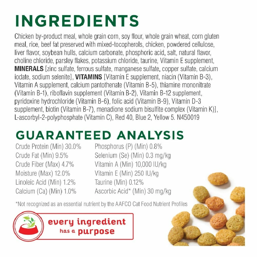 Chicken By-product Meal, Whole Grain Corn, Soy Flour, Whole Grain Wheat, Corn Gluten Meal, Rice, Beef Fat Preserved With Mixed-tocopherols, Chicken, Powdered Cellulose, Liver Flavor, Soybean Hulls, Calcium Carbonate, Phosphoric Acid, Salt, Natural Flavor, Choline Chloride, Parsley Flakes, Potassium Chloride, Taurine, Vitamin E Supplement, Minerals [Zinc Sulfate, Ferrous Sulfate, Manganese Sulfate, Copper Sulfate, Calcium Iodate, Sodium Selenite], Vitamins [Vitamin E Supplement, Niacin (Vitamin B-3), Vitamin A Supplement, Calcium Pantothenate (Vitamin B-5), Thiamine Mononitrate (Vitamin B-1), Riboflavin Supplement (Vitamin B-2), Vitamin B-12 Supplement, Pyridoxine Hydrochloride (Vitamin B-6), Folic Acid (Vitamin B-9), Vitamin D-3 Supplement, Biotin (Vitamin B-7), Menadione Sodium Bisulfite Complex (Vitamin K)], L-ascorbyl-2-polyphosphate (Vitamin C), Red 40, Blue 2, Yellow 5. N450019.