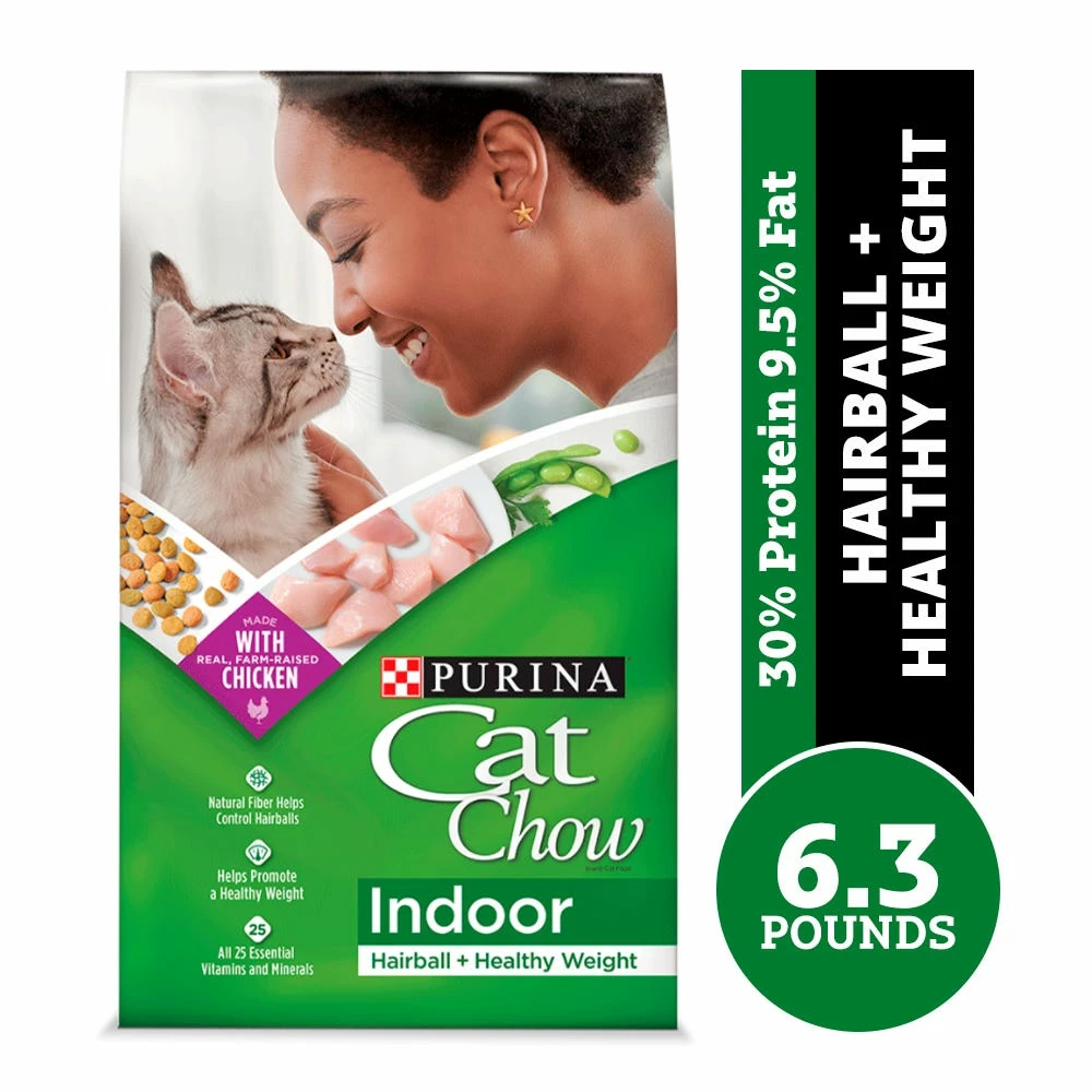 Support the adventures of your indoor cat with Purina Cat Chow Indoor Hairball + Healthy Weight Adult Dry Cat Food. Compared to her outdoor cousins, your indoor kitty may be less physically active. This adult cat food kibble delivers the specialized nutrition that supports her lower activity routine, whether she’s meowing hello or purring beside you. Every crunchy serving of the indoor cat food meets your feline friend’s energy needs and promotes her healthy weight. A natural fiber blend helps control her hairballs. Plus, real, farm-raised chicken helps create a delicious recipe made with high-quality, responsibly sourced ingredients. Best of all, with 25 essential vitamins and minerals, this indoor adult dry cat food provides the good stuff your furry companion needs for a happy, playful life.