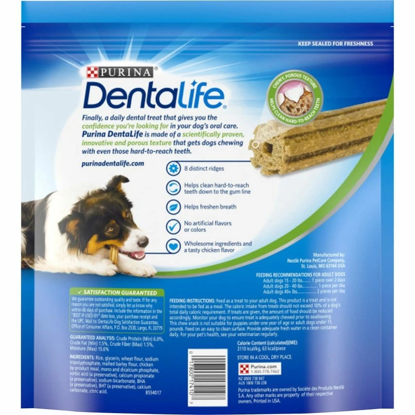 Make dental care part of your dog’s regular routine with DentaLife Daily Oral Care Dental Dog Treats. The tasty chicken flavor keeps him excited about snack time, while the wholesome ingredients let you feel good about serving these treats to your dog. With a formula that’s scientifically tested to reduce tartar buildup, these treats help to deliver a breakthrough clean that’s sure to keep you both smiling. These innovative snacks contain thousands of air pockets for a porous yet chewy texture, and eight distinct ridges help to clean his teeth right down to the gum line, helping you to show your furry friend that you care about his health and well-being every time you reach for a pouch of these delicious dental treats.