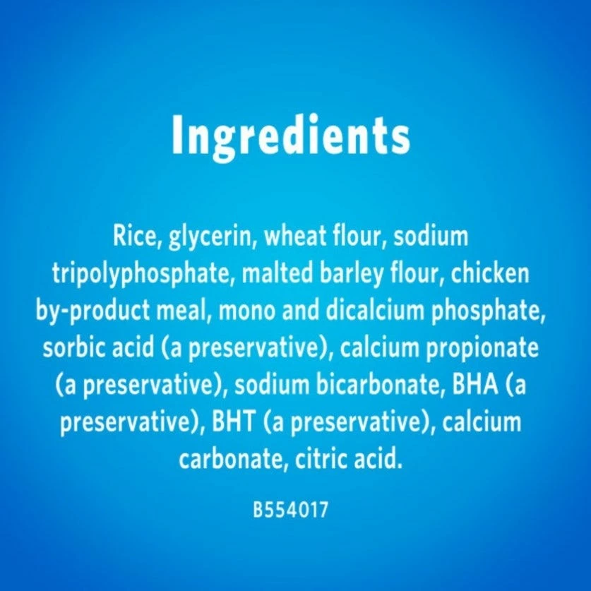 Rice, Glycerin, Wheat Flour, Sodium Tripolyphosphate, Malted Barley Flour, Chicken By-Product Meal, Mono And Dicalcium Phosphate, Sorbic Acid (A Preservative), Calcium Propionate (A Preservative), Sodium Bicarbonate, BHA (A Preservative), BHT (A Preservative), Calcium Carbonate, Citric Acid. B554017