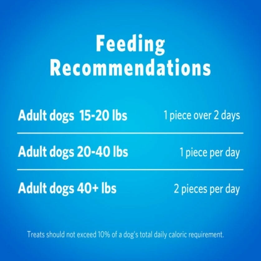 Feed as a treat to your Adult dog. This product is a treat and is not intended to be fed as a meal. The caloric intake from treats should not exceed 10% of a dog’s total daily caloric requirement. If treats are given, the amount of food should be reduced accordingly. Monitor your dog to ensure treat is adequately chewed prior to swallowing. This chew snack is not suitable for puppies under 1 year of age or Adult dogs under 15 lbs. Feed on an easy to clean surface. Provide adequate fresh water in a clean container daily. Store in a cool, dry place.