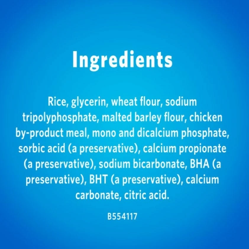 Rice, Glycerin, Wheat Flour, Sodium Tripolyphosphate, Malted Barley Flour, Chicken By-Product Meal, Mono And Dicalcium Phosphate, Sorbic Acid (A Preservative), Calcium Propionate (A Preservative), Sodium Bicarbonate, BHA (A Preservative), BHT (A Preservative), Calcium Carbonate, Citric Acid. B554117