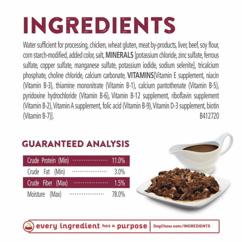 Water Sufficient For Processing, Chicken, Wheat Gluten, Meat By-Products, Liver, Beef, Soy Flour, Corn Starch-Modified, Added Color, Salt, MINERALS [Potassium Chloride, Zinc Sulfate, Ferrous Sulfate, Copper Sulfate, Manganese Sulfate, Potassium Iodide, Sodium Selenite], Tricalcium Phosphate, Choline Chloride, Calcium Carbonate, VITAMINS [Vitamin E Supplement, Niacin (Vitamin B-3), Thiamine Mononitrate (Vitamin B-1), Calcium Pantothenate (Vitamin B-5), Pyridoxine Hydrochloride (Vitamin B-6), Vitamin B-12 Supplement, Riboflavin Supplement (Vitamin B-2), Vitamin A Supplement, Folic Acid (Vitamin B-9), Vitamin D-3 Supplement, Biotin (Vitamin B-7)]. A412718.