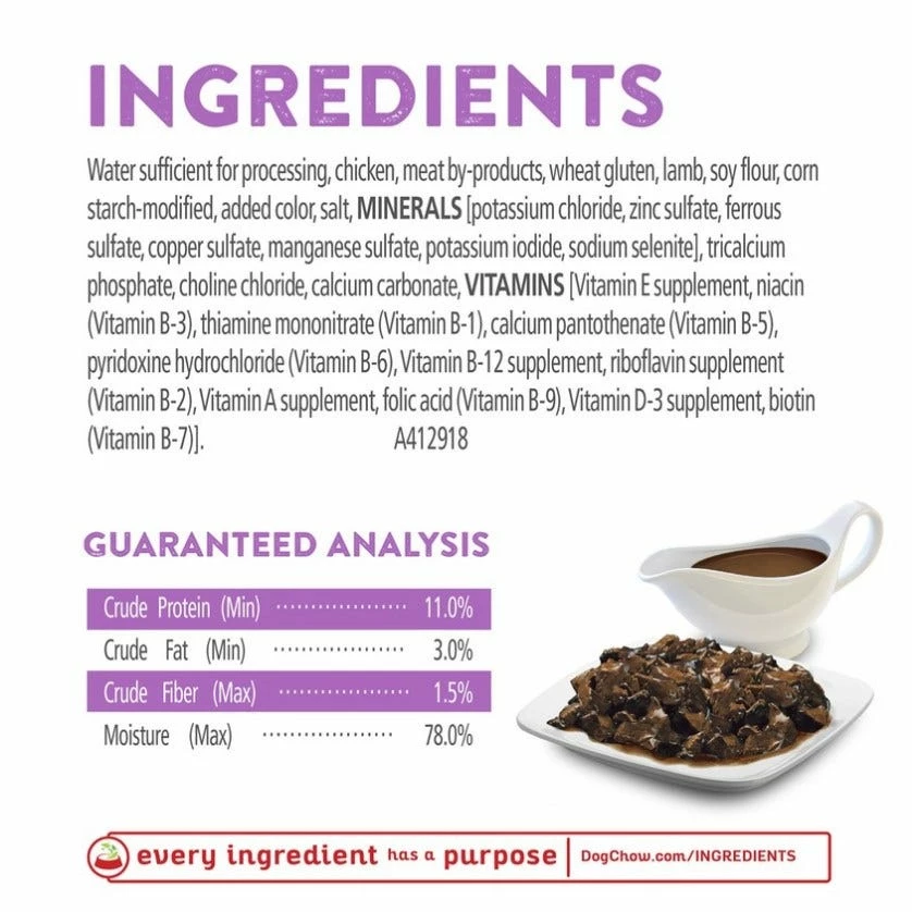 Water Sufficient For Processing, Chicken, Meat By-Products, Wheat Gluten, Lamb, Soy Flour, Corn Starch-Modified, Added Color, Salt, Minerals[Potassium Chloride, Zinc Sulfate, Ferrous Sulfate, Copper Sulfate, Manganese Sulfate, Potassium Iodide, Sodium Selenite], Tricalcium Phosphate, Choline Chloride, Calcium Carbonate, Vitamins[Vitamin E Supplement, Niacin (Vitamin B-3), Thiamine Mononitrate (Vitamin B-1), Calcium Pantothenate (Vitamin B-5), Pyridoxine Hydrochloride (Vitamin B-6), Vitamin B-12 Supplement, Riboflavin Supplement (Vitamin B-2), Vitamin A Supplement, Folic Acid (Vitamin B-9), Vitamin D-3 Supplement, Biotin (Vitamin B-7)]. A412918.