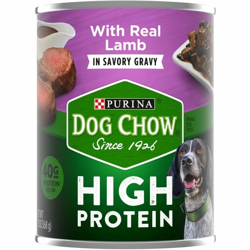 Serve your best friend the savory flavor he craves with Purina Dog Chow High Protein wet dog food. Specially designed to boost your pup with essential, muscle-building nutrients, this hearty recipe packs 40 grams of protein into every can for a meaty meal that supports his every move. Made with real lamb, swimming in savory gravy and bursting with mouthwatering scents, this dog food delivers everything your BFF is looking for at dinner time. And each serving gives him the 100% complete and balanced nutrition you expect. Plus, it’s made without any artificial flavors or preservatives, so you know you can trust every bite. Treat your sidekick to a meal truly designed to fuel his adventures—with Dog Chow.