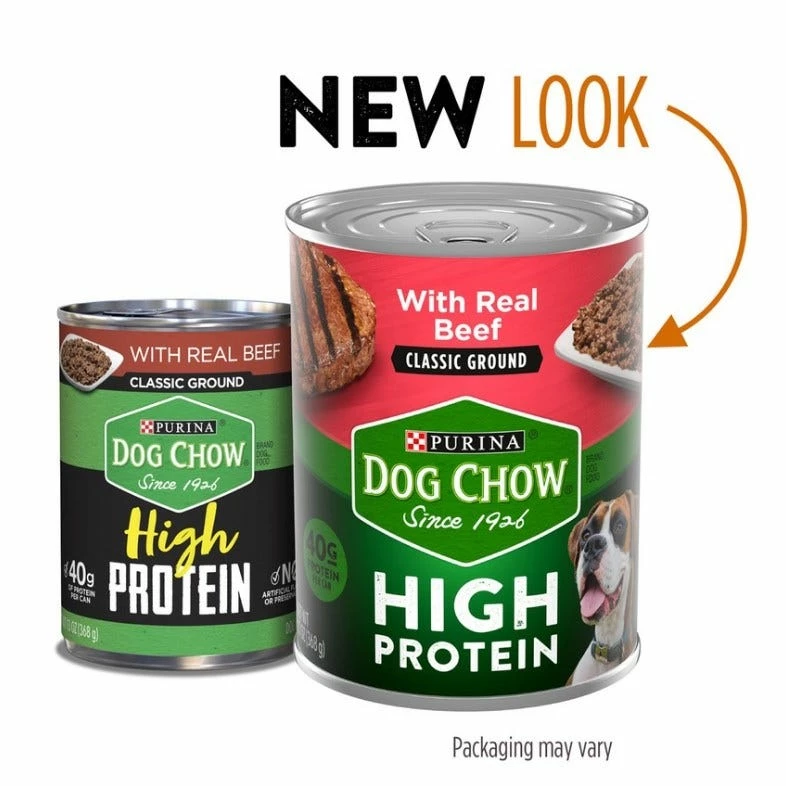 Serve your best friend the savory flavor he craves with Purina Dog Chow High Protein wet dog food. Specially designed to boost your pup with essential, muscle-building nutrients, this hearty recipe packs 40 grams of protein into every can for a meaty meal that supports his every move. Made with real beef and bursting with mouthwatering scents, this dog food delivers everything your BFF is looking for at dinner time. And each serving gives him the 100% complete and balanced nutrition you expect. Plus, it’s made without any artificial flavors or preservatives, so you know you can trust every bite. Treat your sidekick to a meal truly designed to fuel his adventures—with Dog Chow.