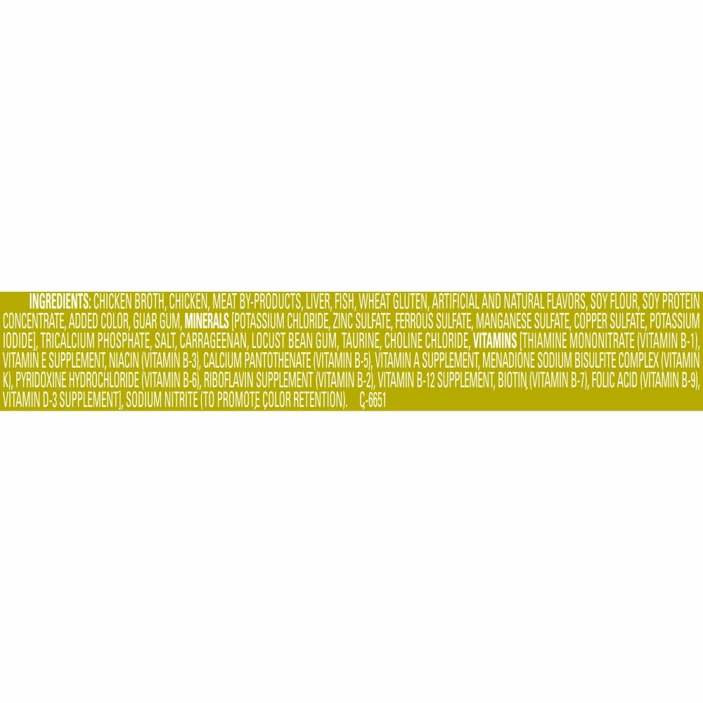 Chicken Broth, Chicken, Meat By-Products, Liver, Fish, Wheat Gluten, Artificial And Natural Flavors, Soy Flour, Soy Protein Concentrate, Added Color, Guar Gum, Minerals [Potassium Chloride, Zinc Sulfate, Ferrous Sulfate, Manganese Sulfate, Copper Sulfate, Potassium Iodide], Tricalcium Phosphate, Salt, Carrageenan, Locust Bean Gum, Taurine, Choline Chloride, Vitamins [Thiamine Mononitrate (Vitamin B-1), Vitamin E Supplement, Niacin (Vitamin B-3), Calcium Pantothenate (Vitamin B-5), Vitamin A Supplement, Menadione Sodium Bisulfite Complex (Vitamin K), Pyridoxine Hydrochloride (Vitamin B-6), Riboflavin Supplement (Vitamin B-2), Vitamin B-12 Supplement, Biotin (Vitamin B-7), Folic Acid (Vitamin B-9), Vitamin D-3 Supplement], Sodium Nitrite (To Promote Color Retention). C-6651.