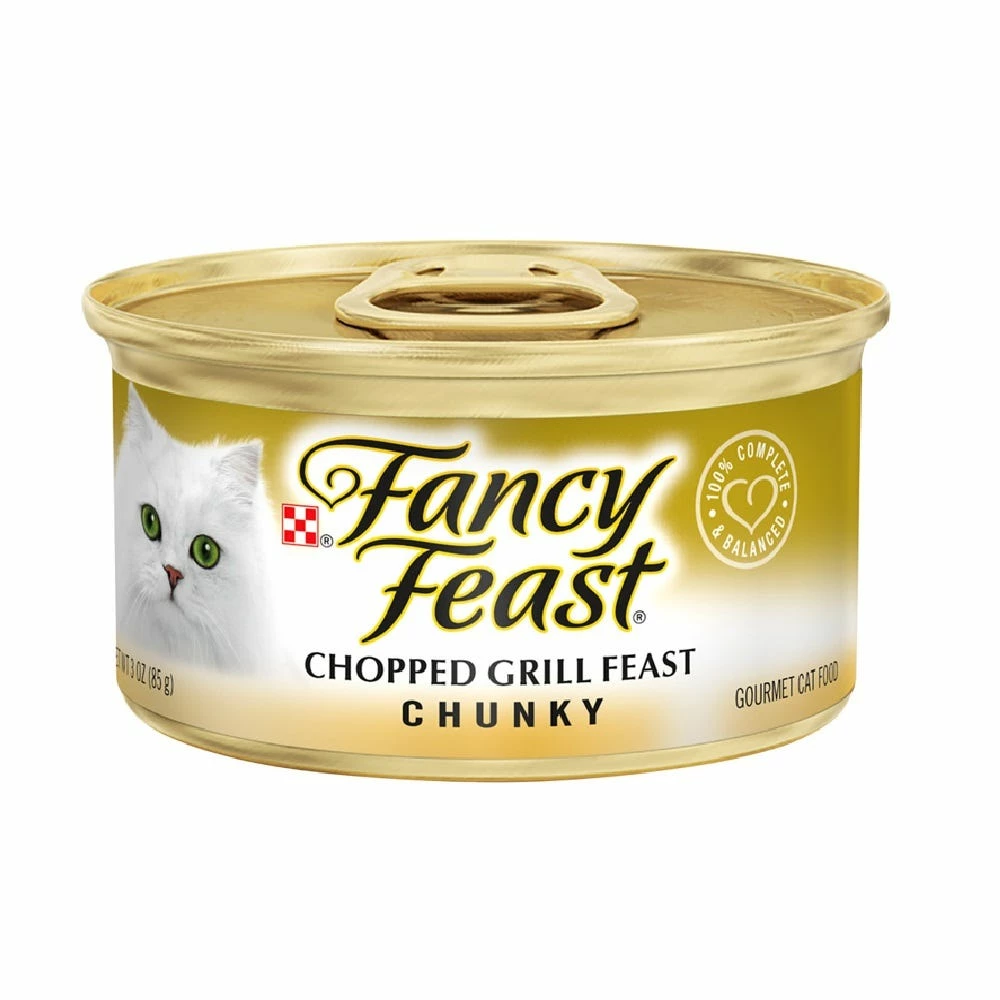 Let your cat delight in the savory flavors of Purina Fancy Feast Chunky Chopped Grill Feast wet cat food. Succulent chunks of chicken provide her the taste cats love, and the finely ground pate surrounding the chicken gives this gourmet cat food a delightful texture she’s sure to purr for. The high-quality ingredients in every serving let your curious cat know you care about the foods you serve her, and the 100% complete and balanced nutrition helps support her overall health and wellness. With an enticing appearance, this canned wet cat food keeps her engaged throughout mealtime. Watch her as she sinks her teeth into the wholesome goodness in each bowlful, and rest easy knowing she’s getting an exceptional level of taste. Take your cat’s taste buds on a flavor adventure every time you serve this Purina Fancy Feast recipe, or mix things up at mealtime with our mouthwatering Chunky Turkey Feast or Chunky Chopped Grill Feast recipe to satisfy her craving for variety.