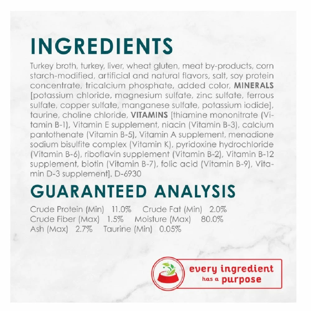 Turkey Broth, Turkey, Liver, Wheat Gluten, Meat By-Products, Corn Starch-Modified, Artificial And Natural Flavors, Salt, Soy Protein Concentrate, Tricalcium Phosphate, Added Color, Minerals [Potassium Chloride, Magnesium Sulfate, Zinc Sulfate, Ferrous Sulfate, Copper Sulfate, Manganese Sulfate, Potassium Iodide], Taurine, Choline Chloride, Vitamins [Thiamine Mononitrate (Vitamin B-1), Vitamin E Supplement, Niacin (Vitamin B-3), Calcium Pantothenate (Vitamin B-5), Vitamin A Supplement, Menadione Sodium Bisulfite Complex (Vitamin K), Pyridoxine Hydrochloride (Vitamin B-6), Riboflavin Supplement (Vitamin B-2), Vitamin B-12 Supplement, Biotin (Vitamin B-7), Folic Acid (Vitamin B-9), Vitamin D-3 Supplement]. D-6930.