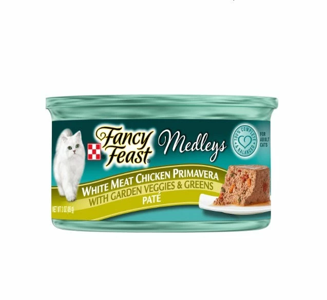 Let your cat feast on the savory flavors of Purina Fancy Feast Medleys White Meat Chicken Primavera Pate wet cat food. The real white meat chicken delivers the taste cats crave, and accents of garden veggies and greens add an artful finishing touch. With its smooth pate texture, this gourmet wet cat food is sure to keep her engaged at mealtime. Essential vitamins and minerals help to support her overall health and wellness, so you can feel good about placing this delectable recipe in her dish. Inspired by classic culinary creations, this Fancy Feast Medleys selection features high-quality ingredients and a sophisticated flavor to help make your moments with your favorite feline friend special. Watch her as she prances her way to her dish when you open a can of this wet cat food, and let her delight in the inspired flavors that your cat is bound to thank you for.