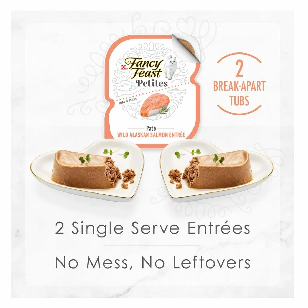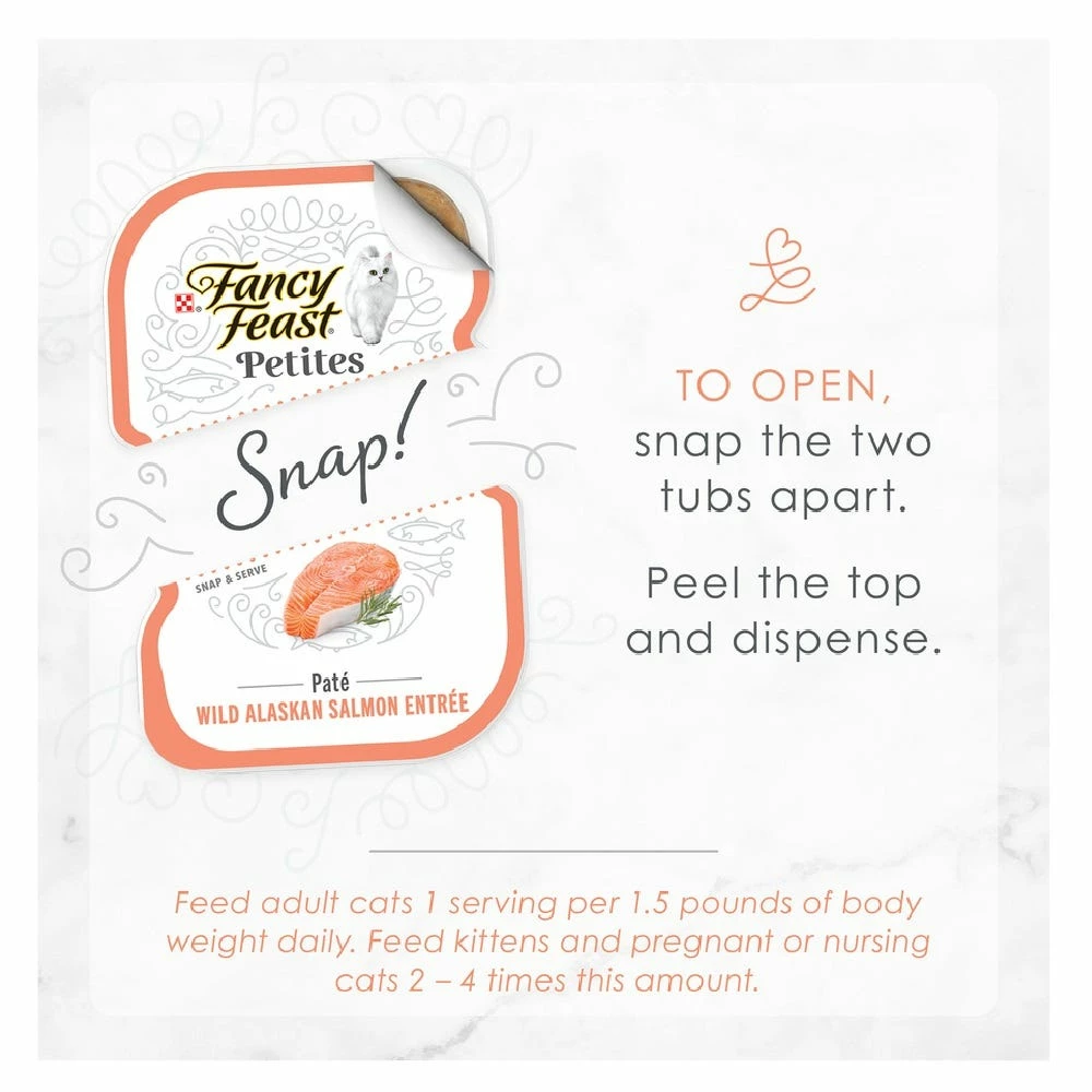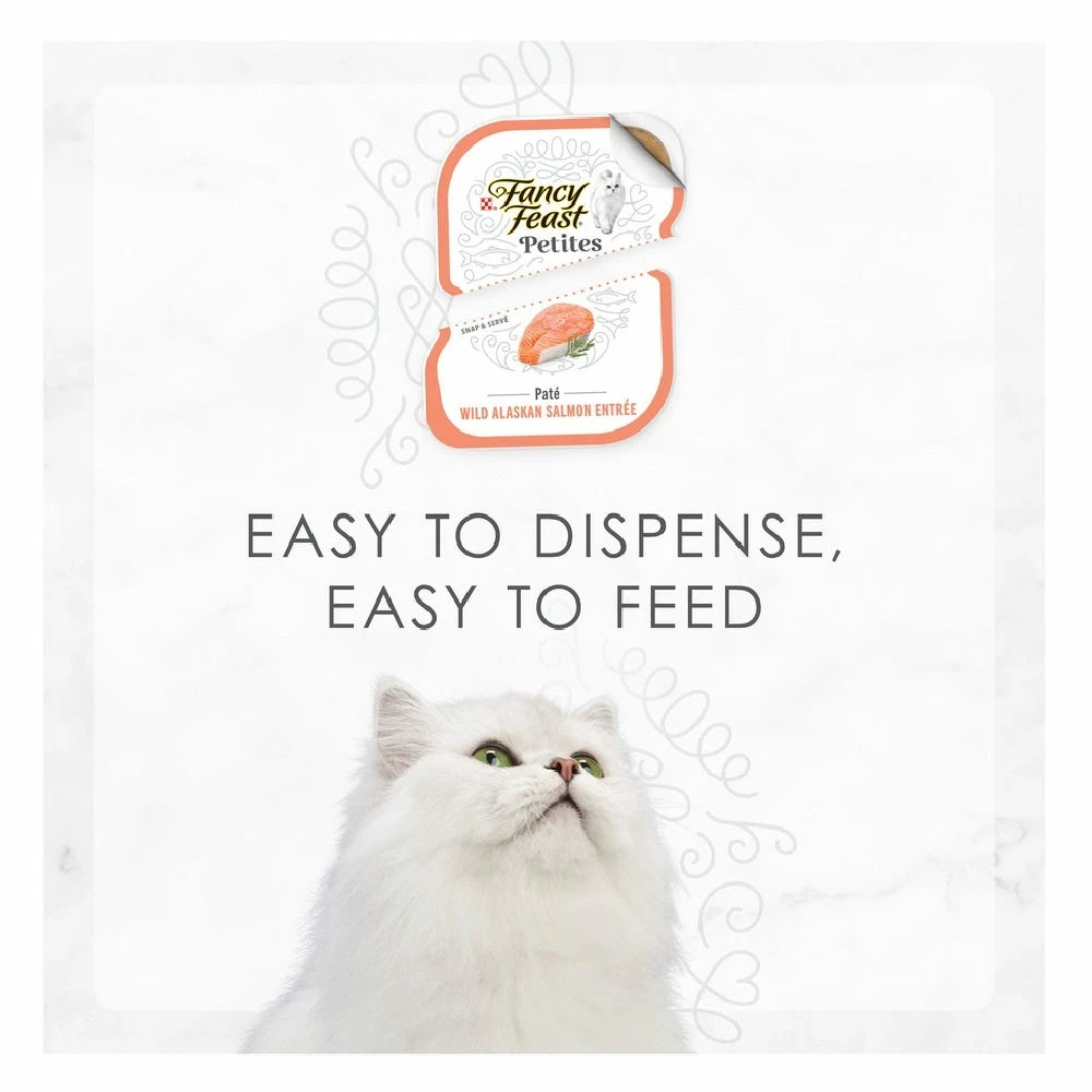 Purina Fancy Feast Petites Wild Alaskan Salmon makes a super nourishing meal that’s sure to satisfy any kitty companion! This pâté delivers a tantalizing texture and complete nutrition, helping keep adult cats happy and healthy. It’s loaded up with yummy, healthy salmon, yet free of artificial colors and preservatives. Pet parents will also love the convenient packaging—each tray easily snaps apart, creating two perfectly sized portions. When it comes to food that’s both delicious and nutritious, nobody does it better than Fancy Feast!