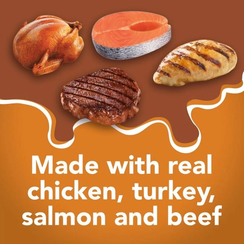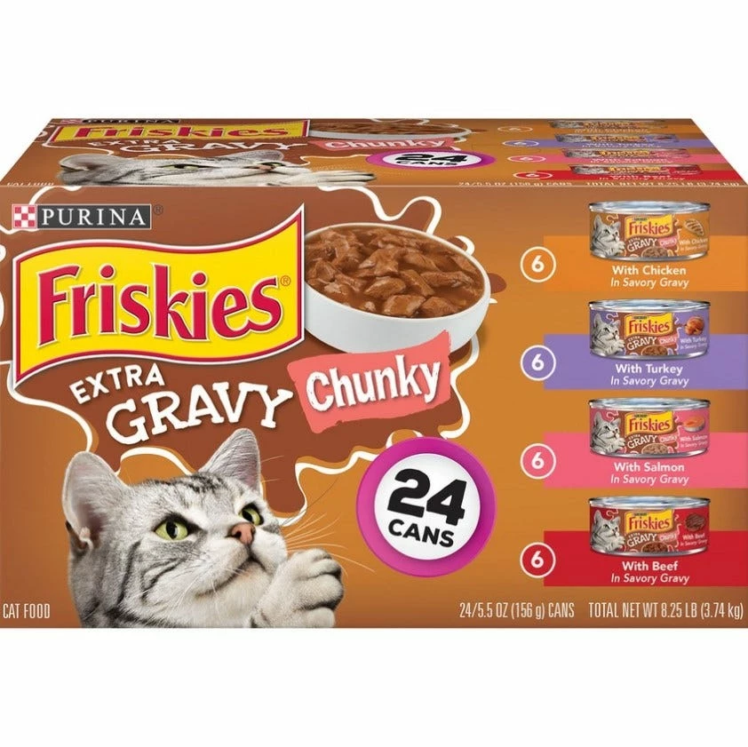 Give your cat one more reason to lick her whiskers at mealtime when she tastes the extra gravy found in each can of this Purina Friskies Extra Gravy Chunky wet cat food variety pack. Four mouthwatering recipes deliver the variety adventure-loving cats crave, and each entrée is made with real meat, poultry or seafood for the flavors she loves. Extra savory gravy adds flavor, tempting her to lick her dish clean at feeding time. The tender, meaty chunks deliver an enticing texture she’s sure to savor, and the tantalizing aroma draws her to her dish and encourages her to lap up every purrfect drop. Choose a different recipe at each feeding to keep her excited about the foods you feed her and watch your cat companion come running to her bowl in anticipation of a yum-filled dining experience that will make her purr. For even more fun at mealtime, let your adventurous cat explore the complete line of Purina Friskies wet and dry foods.