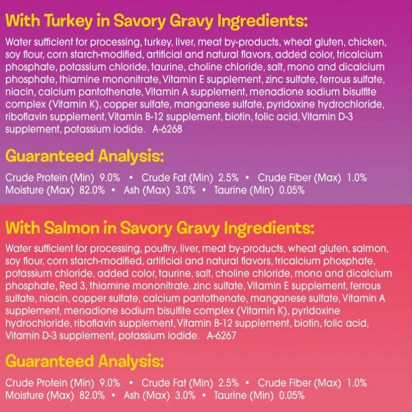 Water, Turkey, Liver, Meat By-Products, Wheat Gluten, Chicken, Soy Flour, Corn Starch-Modified, Artificial And Natural Flavors, Added Color, Tricalcium Phosphate, MINERALS [Potassium Chloride, Mono And Dicalcium Phosphate, Zinc Sulfate, Ferrous Sulfate, Copper Sulfate, Manganese Sulfate, Potassium Iodide], Taurine, Choline Chloride, Salt, VITAMINS [Thiamine Mononitrate (Vitamin B-1), Vitamin E Supplement, Niacin (Vitamin B-3), Calcium Pantothenate (Vitamin B-5), Vitamin A Supplement, Menadione Sodium Bisulfite Complex (Vitamin K), Pyridoxine Hydrochloride (Vitamin B-6), Riboflavin Supplement (Vitamin B-2), Vitamin B-12 Supplement, Biotin (Vitamin B-7), Folic Acid (Vitamin B-9), Vitamin D-3 Supplement]