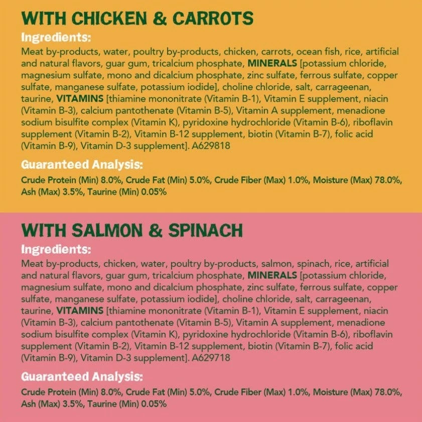 Meat By-Products, Chicken, Water, Poultry By-Products, Salmon, Spinach, Rice, Artificial And Natural Flavors, Guar Gum, Tricalcium Phosphate, Minerals [Potassium Chloride, Magnesium Sulfate, Mono And Dicalcium Phosphate, Zinc Sulfate, Ferrous Sulfate, Copper Sulfate, Manganese Sulfate, Potassium Iodide], Choline Chloride, Salt, Carrageenan, Taurine, Vitamins [Thiamine Mononitrate (Vitamin B-1), Vitamin E Supplement, Niacin (Vitamin B-3), Calcium Pantothenate (Vitamin B-5), Vitamin A Supplement, Menadione Sodium Bisulfite Complex (Vitamin K), Pyridoxine Hydrochloride (Vitamin B-6), Riboflavin Supplement (Vitamin B-2), Vitamin B-12 Supplement, Biotin (Vitamin B-7), Folic Acid (Vitamin B-9), Vitamin D-3 Supplement]. A629718