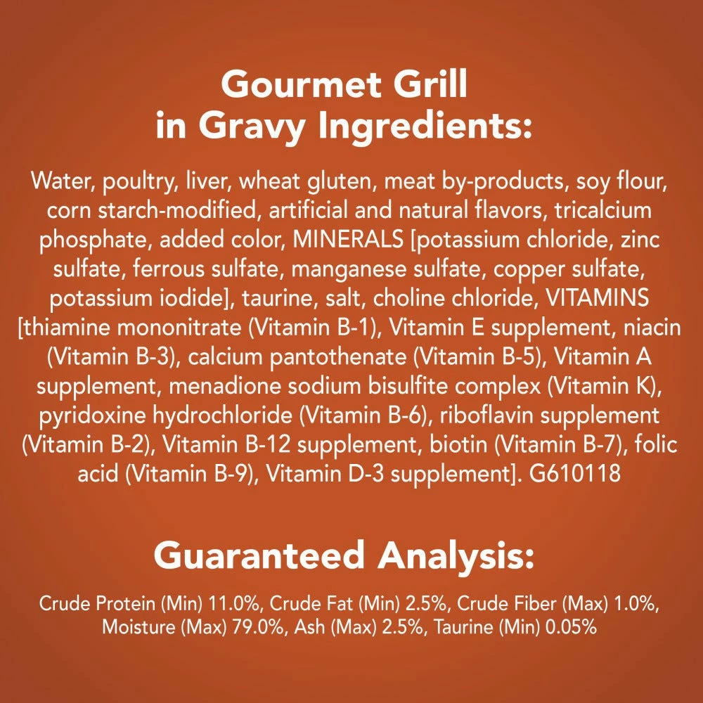 Water, Poultry, Liver, Wheat Gluten, Meat By-Products, Soy Flour, Corn Starch-Modified, Artificial And Natural Flavors, Tricalcium Phosphate, Added Color, MINERALS [Potassium Chloride, Zinc Sulfate, Ferrous Sulfate, Manganese Sulfate, Copper Sulfate, Potassium Iodide], Taurine, Salt, Choline Chloride, VITAMINS [Thiamine Mononitrate (Vitamin B-1), Vitamin E Supplement, Niacin (Vitamin B-3), Calcium Pantothenate (Vitamin B-5), Vitamin A Supplement, Menadione Sodium Bisulfite Complex (Vitamin K), Pyridoxine Hydrochloride (Vitamin B-6), Riboflavin Supplement (Vitamin B-2), Vitamin B-12 Supplement, Biotin (Vitamin B-7), Folic Acid (Vitamin B-9), Vitamin D-3 Supplement]. G610118.
