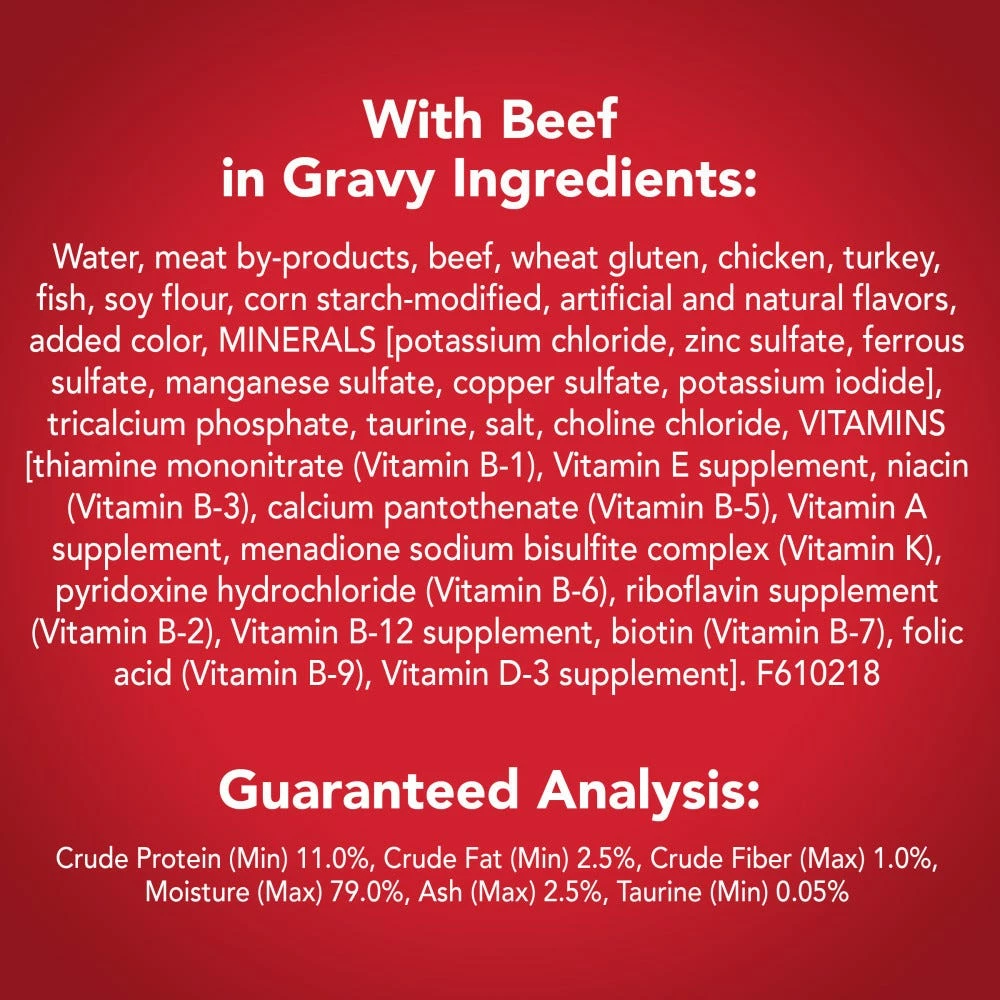 Water, Meat By-Products, Beef, Wheat Gluten, Chicken, Turkey, Fish, Soy Flour, Corn Starch-Modified, Artificial And Natural Flavors, Added Color, MINERALS [Potassium Chloride, Zinc Sulfate, Ferrous Sulfate, Manganese Sulfate, Copper Sulfate, Potassium Iodide], Tricalcium Phosphate, Taurine, Salt, Choline Chloride, VITAMINS [Thiamine Mononitrate (Vitamin B-1), Vitamin E Supplement, Niacin (Vitamin B-3), Calcium Pantothenate (Vitamin B-5), Vitamin A Supplement, Menadione Sodium Bisulfite Complex (Vitamin K), Pyridoxine Hydrochloride (Vitamin B-6), Riboflavin Supplement (Vitamin B-2), Vitamin B-12 Supplement, Biotin (Vitamin B-7), Folic Acid (Vitamin B-9), Vitamin D-3 Supplement]. F610218.