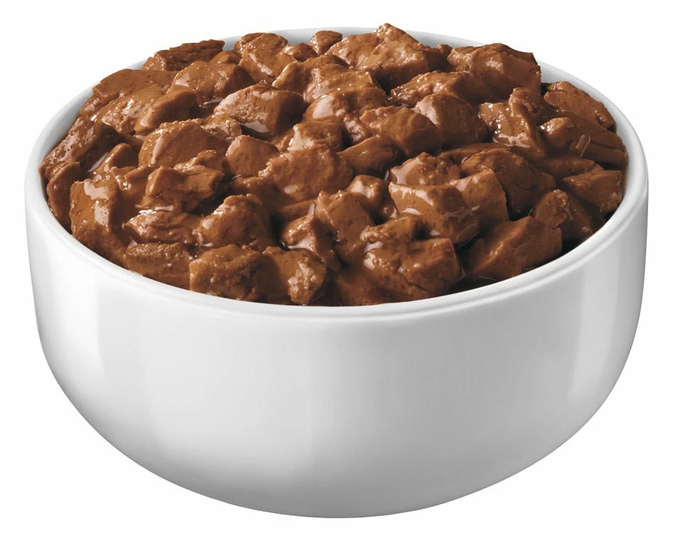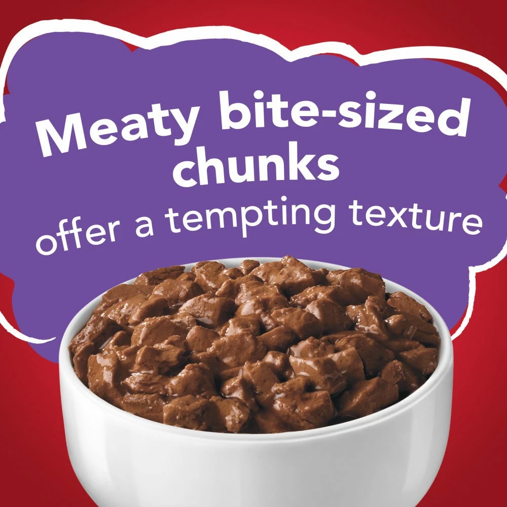 - Bite-size meaty chunks and savory gravy will bring him dashing to his dish and purring for more
