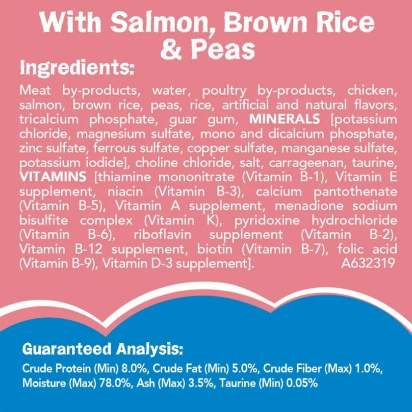 Meat by-products, water, poultry by-products, chicken, salmon, brown rice, peas, rice, artificial and natural flavors, tricalcium phosphate, guar gum, MINERALS [potassium chloride, magnesium sulfate, mono and dicalcium phosphate, zinc sulfate, ferrous sulfate, copper sulfate, manganese sulfate, potassium iodide], choline chloride, salt, carrageenan, taurine, VITAMINS [thiamine mononitrate (Vitamin B-1), Vitamin E supplement, niacin (Vitamin B-3), calcium pantothenate (Vitamin B-5), Vitamin A supplement, menadione sodium bisulfite complex (Vitamin K), pyridoxine hydrochloride (Vitamin B-6), riboflavin supplement (Vitamin B-2), Vitamin B-12 supplement, biotin (Vitamin B-7), folic acid (Vitamin B9), Vitamin D-3 supplement]. A632319