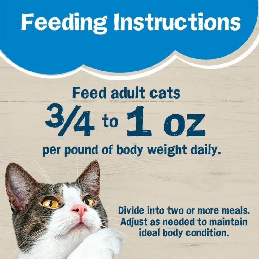 Feed adult cats 3/4 to 1 oz per pound of body weight daily. Divide into two or more meals. Adjust as needed to maintain ideal body condition. Refrigerate any unused portions. Always provide fresh water to your pets.