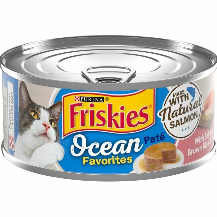 Purina Friskies Ocean Favorites With Salmon, Brown Rice, and Peas is formulated to meet the nutritional levels established by the AAFCO Cat Food Nutrient Profiles for maintenance of adult cats.