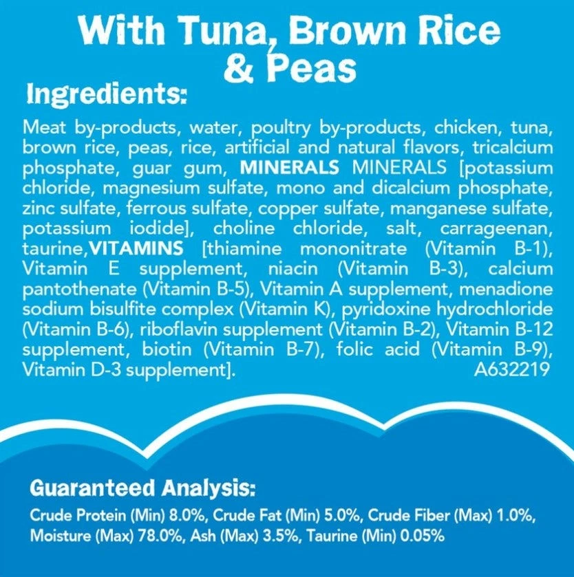 Meat By-Products, Water, Poultry By-products, Chicken, Tuna, Brown Rice, Peas, Rice, Artificial And Natural Flavors, Tricalcium Phosphate, Guar Gum, Minerals [Potassium Chloride, Magnesium Sulfate, Mono And Dicalcium Phosphate, Zinc Sulfate, Ferrous Sulfate, Copper Sulfate, Manganese Sulfate, Potassium Iodide], Choline Chloride, Salt, Carrageenan, Taurine, Vitamins [Thiamine Mononitrate (Vitamin B-1), Vitamin E Supplement, Niacin (Vitamin B-3), Calcium Pantothenate (Vitamin B-5), Vitamin A Supplement, Menadione Sodium Bisulfite Complex (Vitamin K), Pyridoxine Hydrochloride (Vitamin B-6), Riboflavin Supplement (Vitamin B-2), Vitamin B-12 Supplement, Biotin (Vitamin B-7), Folic Acid (Vitamin B-9), Vitamin D-3 Supplement]. A632219
