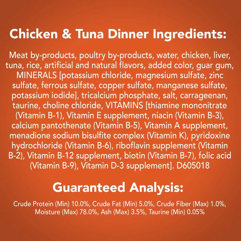 Meat By-Products, Poultry By-Products, Water, Chicken, Liver, Tuna, Rice, Artificial And Natural Flavors, Added Color, Guar Gum, Minerals [Potassium Chloride, Magnesium Sulfate, Zinc Sulfate, Ferrous Sulfate, Copper Sulfate, Manganese Sulfate, Potassium Iodide], Tricalcium Phosphate, Salt, Carrageenan, Taurine, Choline Chloride, Vitamins [Thiamine Mononitrate (Vitamin B-1), Vitamin E Supplement, Niacin (Vitamin B-3), Calcium Pantothenate (Vitamin B-5), Vitamin A Supplement, Menadione Sodium Bisulfite Complex (Vitamin K), Pyridoxine Hydrochloride (Vitamin B-6), Riboflavin Supplement (Vitamin B-2), Vitamin B-12 Supplement, Biotin (Vitamin B-7), Folic Acid (Vitamin B-9), Vitamin D-3 Supplement]. D605018