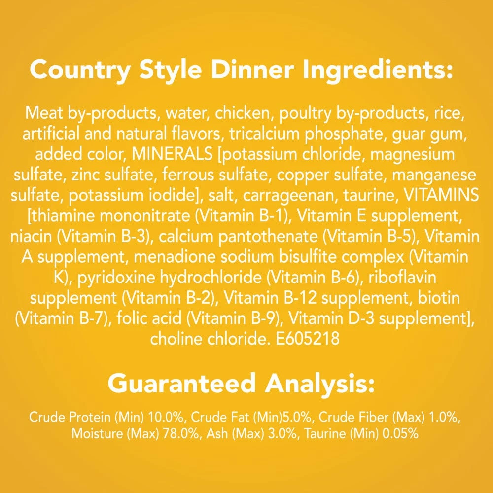 Offer your feline friend a taste of country cooking with Purina Friskies Pate Country Style Dinner Wet Cat Food. Inspired by the down home meals grandma made, this chicken classic is loaded with savory flavor for your four-legged companion. Each bite of the smooth pate cat food has a tender texture that’s kitty-approved. And the enticing aroma tips her off that you’ve filled her dish with a truly delectable chicken pate cat food entree. Plus, every serving of this premium cat food helps support her nose-to-tail well-being with 100% complete and balanced nutrition for adult cats. Variety is the spice of life for kitties. Fill her dish with a purr-fect combo of taste, texture and aroma, along with the nutrition she needs for a lifetime of jumping and playing.