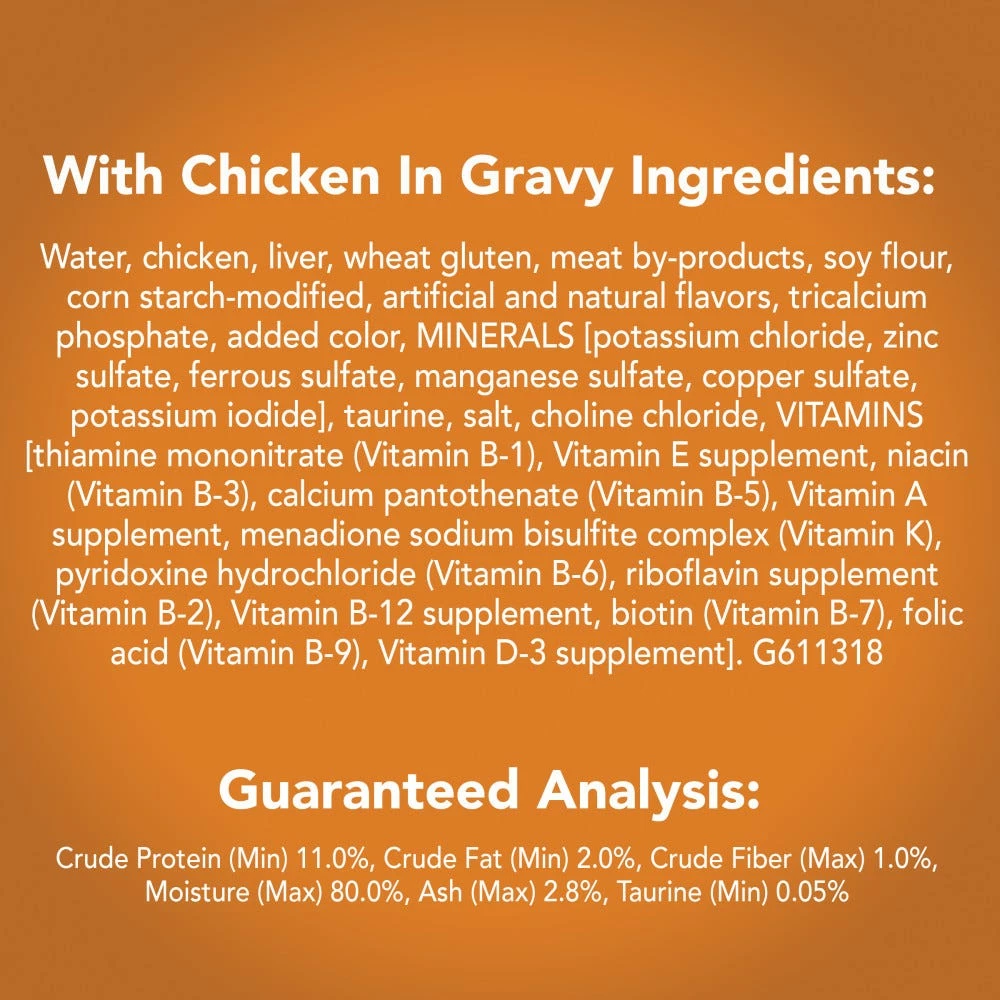 Water, Chicken, Liver, Wheat Gluten, Meat By-Products, Soy Flour, Corn Starch-Modified, Artificial And Natural Flavors, Tricalcium Phosphate, Added Color, MINERALS [Potassium Chloride, Zinc Sulfate, Ferrous Sulfate, Manganese Sulfate, Copper Sulfate, Potassium Iodide], Taurine, Salt, Choline Chloride, VITAMINS [Thiamine Mononitrate (Vitamin B-1), Vitamin E Supplement, Niacin (Vitamin B-3), Calcium Pantothenate (Vitamin B-5), VitaminA Supplement, Menadione Sodium Bisulfite Complex (Vitamin K), Pyridoxine Hydrochloride (Vitamin B-6), Riboflavin Supplement (Vitamin B-2), Vitamin B-12 Supplement, Biotin (Vitamin B-7), Folic Acid (Vitamin B-9), Vitamin D-3 Supplement]. H611319