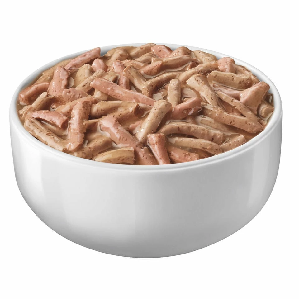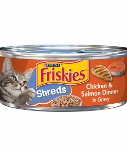 Let the taste of real chicken lure your cat to her dish when you serve Purina Friskies Shreds Chicken & Salmon Dinner in Gravy wet cat food. The tender shreds deliver a mouthwatering texture and appealing look that make each bite a feast for the senses. The rich gravy adds moisture and flavor to every nibble, inviting her to lick her dish clean at mealtime. An enticing aroma lets your cat know a delectable meal is right around the corner, and you can rest easy knowing she’s getting 100% complete and balanced nutrition for kittens and adult cats in every serving. With all that goodness and a yummy taste, this Purina Friskies Shreds recipe is bound to be a favorite for your feline family. Show your cat you pay attention to her cravings for poultry flavor every time you fill her dish with this scrumptious wet cat food variety.