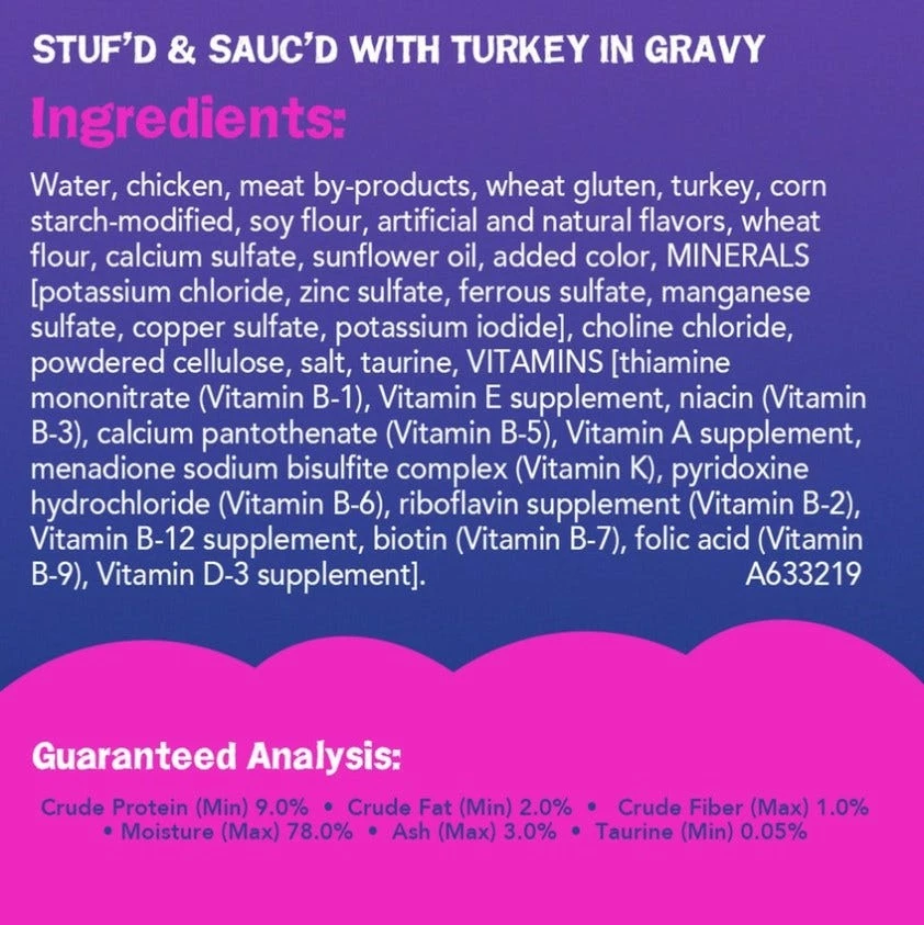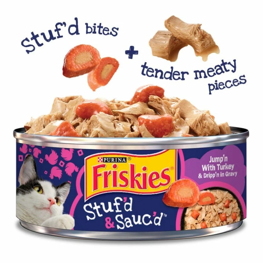Get your cat jumping for joy when you dish out Purina Friskies Stuf’d & Sauc’d Jump’n With Turkey & Dripp’n in Gravy adult wet cat food. This two-texture duo offers your cat plenty of variety in one scrumptious wet cat food with double the deliciousness. We pair tasty stuf’d bites with tender, meaty pieces made with real turkey, both dripp’n in savory gravy. Your cat can revel in an amp’d up meal anytime while receiving the 100% complete and balanced nutrition adult cats need to live their best lives every day. Try all our thrilling premium Friskies wet cat food entrees with amp’d up flavors, mix’d up textures and turn’d up excitement, including this Purina Friskies Stuf’d & Sauc’d Jump’n With Turkey & Dripp’n in Gravy adult wet cat food, to get two paws up from your favorite feline. Convenient pull-tab cans make feeding time quick and easy.