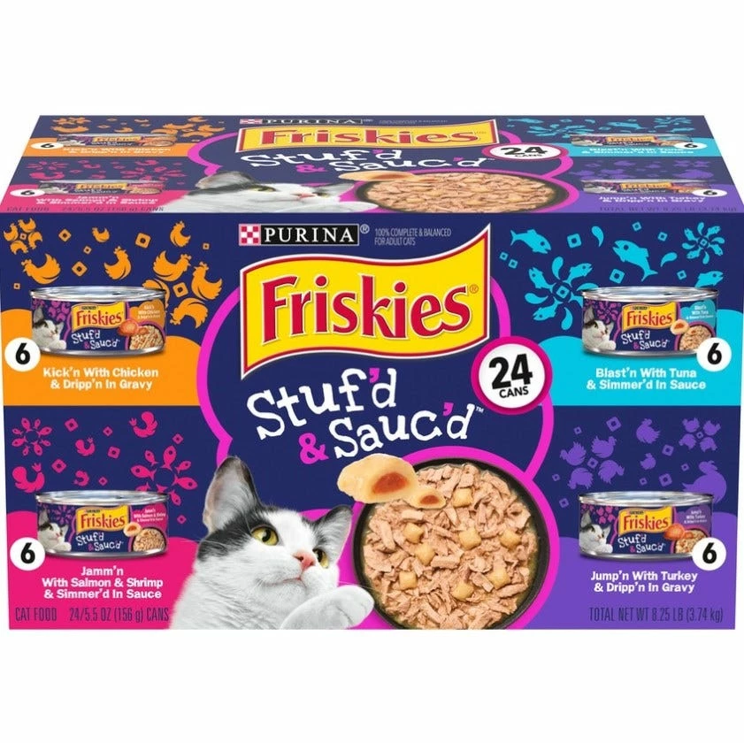 Amp up the excitement at your cat’s mealtime by rotating the four yum-filled, yum-grilled flavors in this Purina Friskies Stuf’d & Sauc’d adult wet cat food variety pack. Two delicious textures let you serve her an amp’d up meal any time that’s so tasty, it’s sure to have her asking, “How’d Friskies do that?” Each delectable entrée features scrumptious stuf’d bites paired with tender, meaty pieces in a savory gravy cats love. It’s a two-texture duo that serves up a mega-thrilling meal in a major way! We lovingly craft each recipe in this Friskies variety pack with real poultry or seafood to give your favorite feline a premium wet cat food meal that makes her purr. While each recipe provides her with double the deliciousness in two yum-filled textures, your adult cat also gets the 100% complete and balanced nutrition she needs to be her exceptional self. Go ahead and pop the pull-tab top on a can from this Purina Friskies Stuf’d & Sauc’d variety pack — and stand back. Your fired-up feline is sure to rush for her dish when she gets wind of what’s coming at her. Trust us when we say that cats can’t get enuf of this stuf!