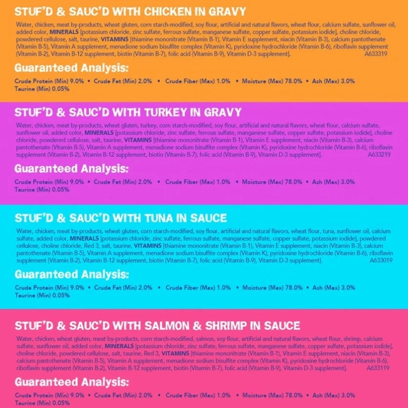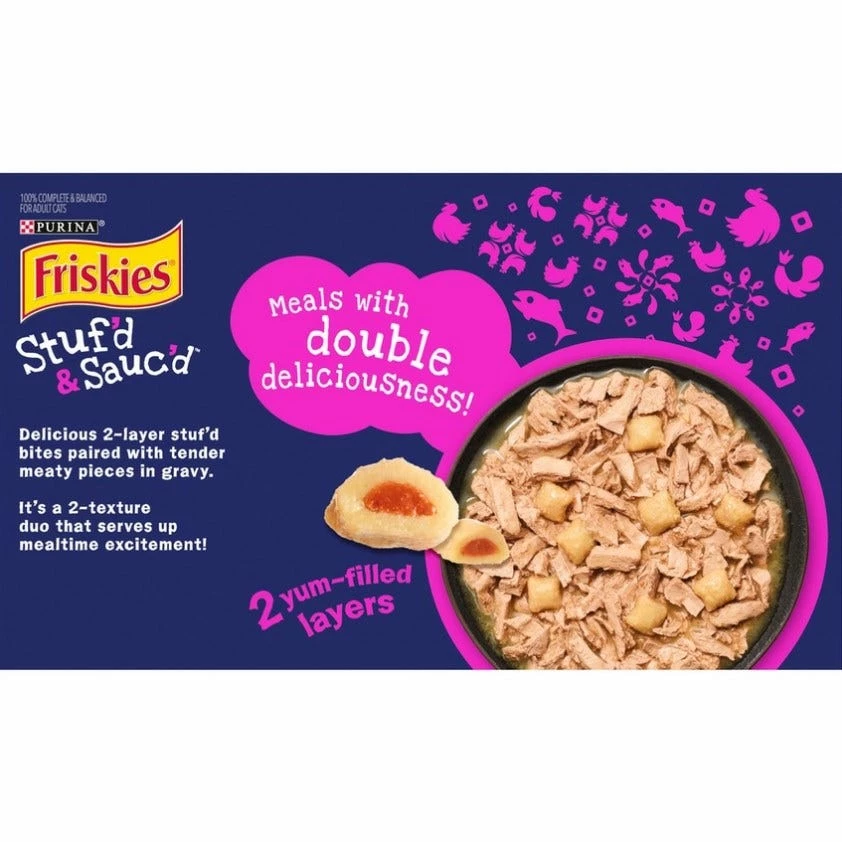 Purina Friskies Stuf’d & Sauc’d is formulated to meet the nutritional levels established by the AAFCO Cat Food Nutrient Profiles for maintenance of adult cats.