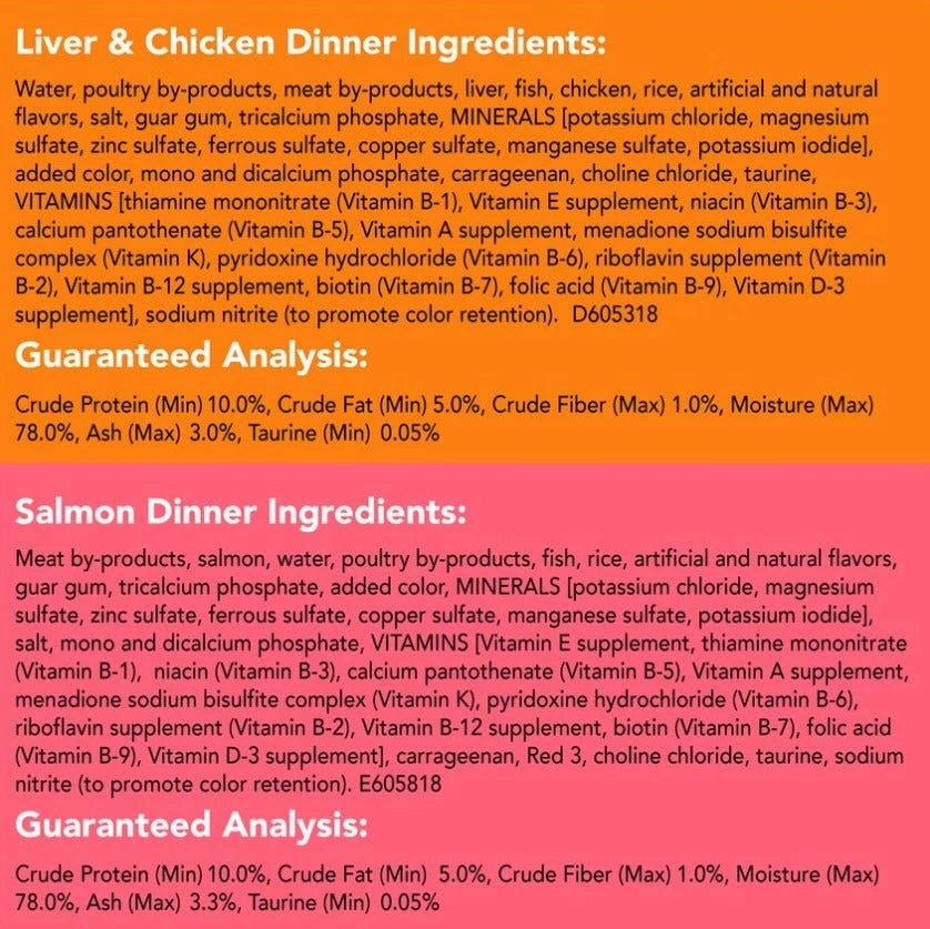 Water, poultry by-products, meat by-products, liver, fish, chicken, rice, artificial and natural flavors, salt, guar gum, tricalcium phosphate, MINERALS [potassium chloride, magnesium sulfate, zinc sulfate, ferrous sulfate, copper sulfate, manganese sulfate, potassium iodide], added color, mono and dicalcium phosphate, carrageenan, choline chloride, taurine, VITAMINS [thiamine mononitrate (Vitamin B-1), Vitamin E supplement, niacin (Vitamin B-3), calcium pantothenate (Vitamin B-5), Vitamin A supplement, menadione sodium bisulfite complex (Vitamin K), pyridoxine hydrochloride (Vitamin B-6), riboflavin supplement (Vitamin B-2), Vitamin B-12 supplement, biotin (Vitamin B-7), folic acid (Vitamin B9), Vitamin D-3 supplement], sodium nitrite (to promote color retention). D605318