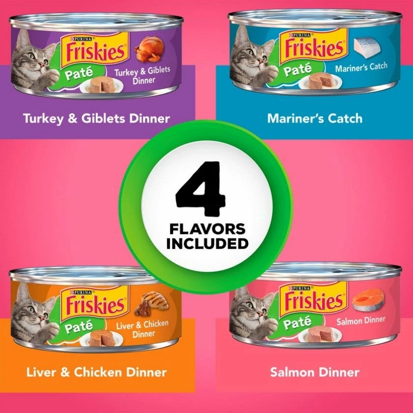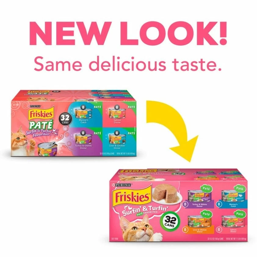 Offer up your cat’s favorite flavors when you stock your pantry with this Purina Friskies Pate Surfin’ & Turfin’ Favorites wet cat food variety pack. Four different tempting entrees deliver poultry or seafood flavor to her dish, and the smooth, tender texture lets her sink her teeth into decadent bites of yum. She’s sure to purr enthusiastically for the tastes found in each delectable recipe, and you can rest easy knowing each serving contains essential vitamins and minerals. With 32 cans in every package, this wet cat food collection ensures you always have a tasty meal ready for your cat companion. Open a can and let the enticing aroma lead her to her dish at mealtime, and watch her delight in the savory goodness that makes this Purina Friskies Pate collection an irresistible way to satisfy her curious cat cravings.