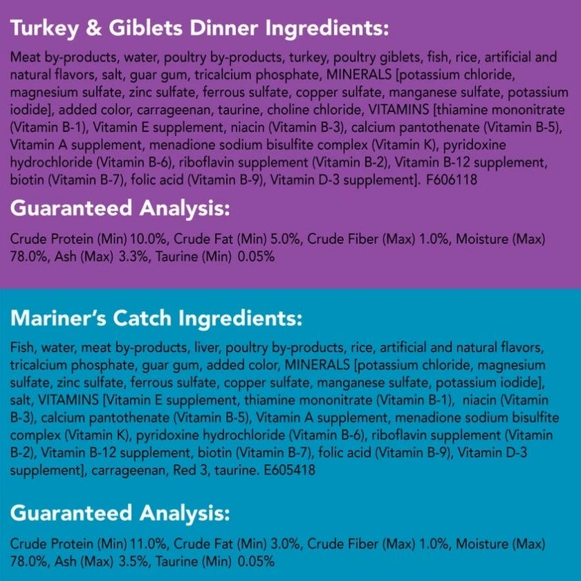 Meat by-products, water, poultry by-products, turkey, poultry giblets, fish, rice, artificial and natural flavors, salt, guar gum, tricalcium phosphate, MINERALS [potassium chloride, magnesium sulfate, zinc sulfate, ferrous sulfate, copper sulfate, manganese sulfate, potassium iodide], added color, carrageenan, taurine, choline chloride, VITAMINS [thiamine mononitrate (Vitamin B-1), Vitamin E supplement, niacin (Vitamin B-3), calcium pantothenate (Vitamin B-5), Vitamin A supplement, menadione sodium bisulfite complex (Vitamin K), pyridoxine hydrochloride (Vitamin B-6), riboflavin supplement (Vitamin B-2), Vitamin B-12 supplement, biotin (Vitamin B-7), folic acid (Vitamin B-9), Vitamin D-3 supplement]. F606118