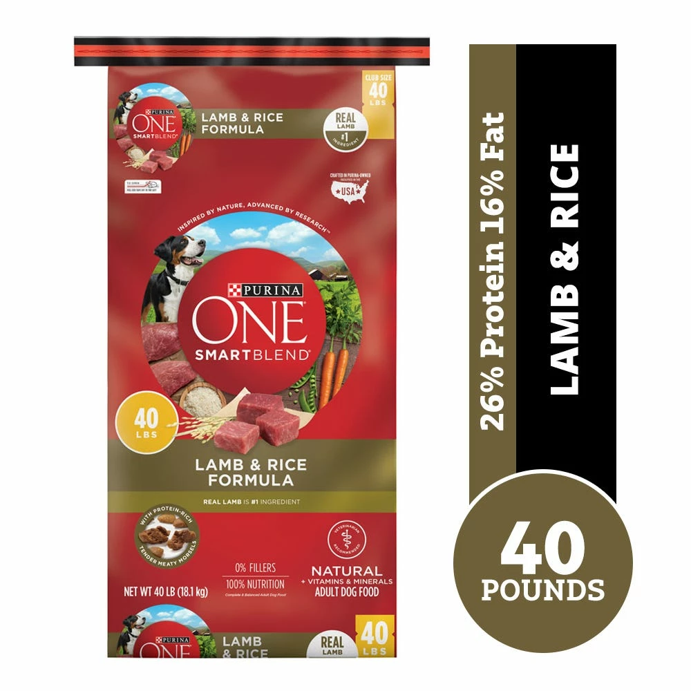 Discover what makes SmartBlend smart. Purina ONE SmartBlend Natural Lamb & Rice Formula dry dog food starts with real lamb as the #1 ingredient to help maintain your dog’s strong muscles, including a healthy heart. Each meal is highly-digestible and has a combination of protein-rich tender, meaty morsels and crunchy kibble, providing a taste your dog will love to help ensure he gets the complete and balanced nutrition he needs. This food for dogs has a dual-defense antioxidant blend of vitamins E and A and minerals zinc and selenium to help support his strong immune system while promoting healthy dog skin, and natural sources of glucosamine help support healthy joints. Purina ONE SmartBlend Natural Lamb & Rice is carefully formulated by Purina dog experts and nutritionists who are committed to delivering a positive impact on your dog’s health. Whether it’s bright eyes, a radiant coat or even an empty bowl that means your dog is enjoying every bite, see the differences Purina ONE SmartBlend can make.