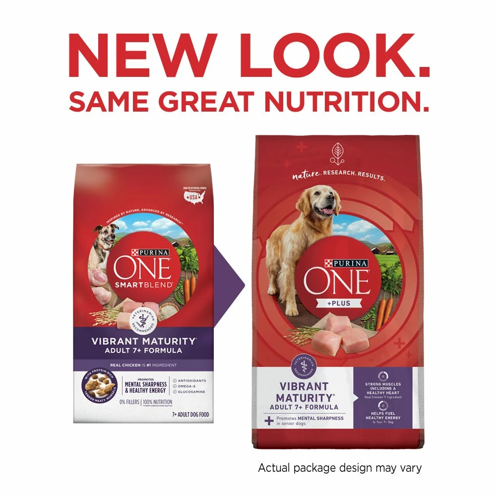Give your senior dog the nutrition he needs along with the taste he loves with Purina ONE SmartBlend Vibrant Maturity Adult 7+ Formula dry dog food. Chicken is the #1 ingredient in our high protein dog food, and 0% fillers means that every ingredient in this dog kibble recipe has a purpose. Enhanced botanical oils in every serving nourish and help promote mental sharpness and healthy energy, and natural sources of glucosamine help support his joints so he can maintain his daily adventures. This Purina ONE senior dog food features a highly digestible formula, ensuring more nutrition goes to work inside of your dog. The 100% complete and balanced nutrition in every serving provides a smart solution for your senior dog’s feeding routine, and a combination of protein-rich, meaty morsels and crunchy kibble in this dry senior dog food gives him the taste and texture he loves. Crafted by a veterinarian-recommended brand, Purina ONE Vibrant Maturity dog food gives you confidence in the meals you serve your loyal companion.