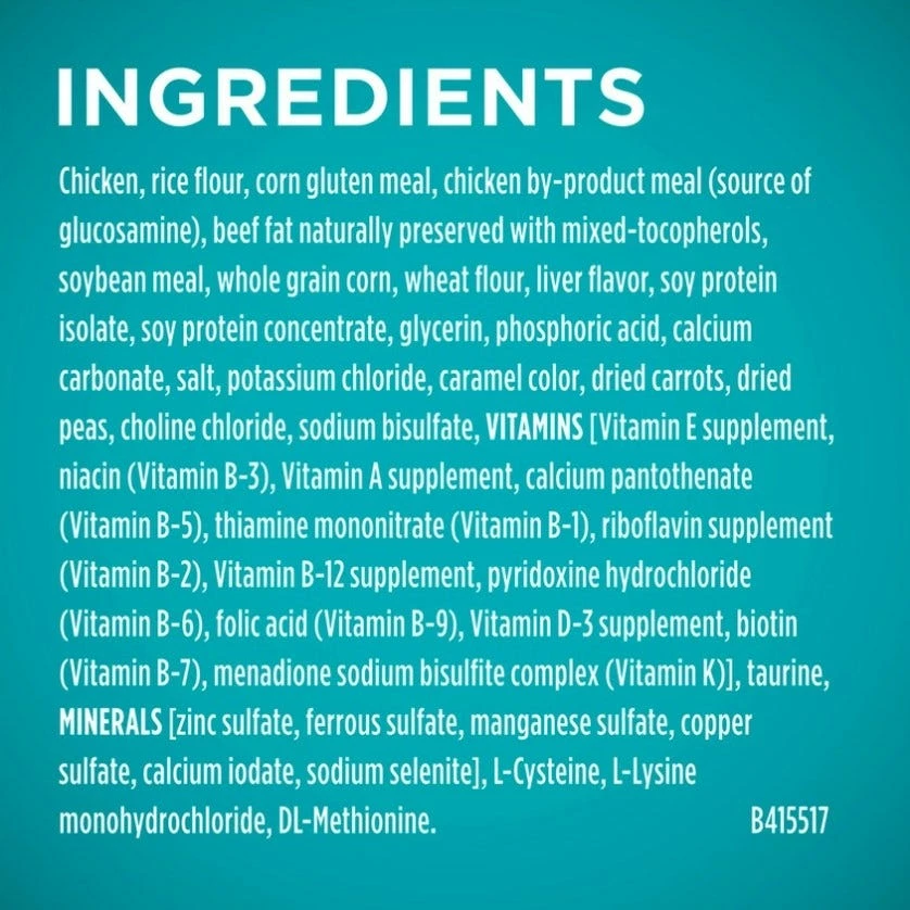 Chicken, Rice Flour, Corn Gluten Meal, Chicken By-Product Meal (Source Of Glucosamine), Beef Fat Naturally Preserved With Mixed-Tocopherols, Soybean Meal, Whole Grain Corn, Wheat Flour, Liver Flavor, Soy Protein Isolate, Soy Protein Concentrate, Glycerin, Phosphoric Acid, Calcium Carbonate, Salt, Potassium Chloride, Caramel Color, Dried Carrots, Dried Peas, Choline Chloride, Sodium Bisulfate, VITAMINS [Vitamin E Supplement, Niacin (Vitamin B-3), Vitamin A Supplement, Calcium Pantothenate (Vitamin B-5), Thiamine Mononitrate (Vitamin B-1), Riboflavin Supplement (Vitamin B-2), Vitamin B-12 Supplement, Pyridoxine Hydrochloride (Vitamin B-6), Folic Acid (Vitamin B-9), Vitamin D-3 Supplement, Biotin (Vitamin B-7), Menadione Sodium Bisulfite Complex (Vitamin K)], Taurine, MINERALS [Zinc Sulfate, Ferrous Sulfate, Manganese Sulfate, Copper Sulfate, Calcium Iodate, Sodium Selenite], L-Cysteine, L-Lysine Monohydrochloride, DL-Methionine. B415517.
