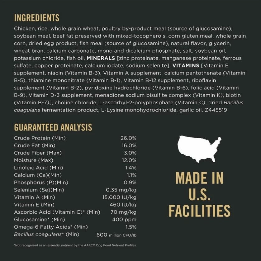 Chicken, Rice, Whole Grain Wheat, Poultry By-product Meal (Source Of Glucosamine), Soybean Meal, Beef Fat Preserved With Mixed-tocopherols, Corn Gluten Meal, Whole Grain Corn, Dried Egg Product, Fish Meal (Source Of Glucosamine), Natural Flavor, Glycerin, Wheat Bran, Calcium Carbonate, Mono And Dicalcium Phosphate, Salt, Soybean Oil, Potassium Chloride, Fish Oil, Minerals [Zinc Proteinate, Manganese Proteinate, Ferrous Sulfate, Copper Proteinate, Calcium Iodate, Sodium Selenite], Vitamins [Vitamin E Supplement, Niacin (Vitamin B-3), Vitamin A Supplement, Calcium Pantothenate (Vitamin B-5), Thiamine Mononitrate (Vitamin B-1), Vitamin B-12 Supplement, Riboflavin Supplement (Vitamin B-2), Pyridoxine Hydrochloride (Vitamin B-6), Folic Acid (Vitamin B-9), Vitamin D-3 Supplement, Menadione Sodium Bisulfite Complex (Vitamin K), Biotin (Vitamin B-7)], Choline Chloride, L-ascorbyl-2-polyphosphate (Vitamin C), Dried Bacillus Coagulans Fermentation Product, L-lysine Monohydrochloride, Garlic Oil. Z445519.