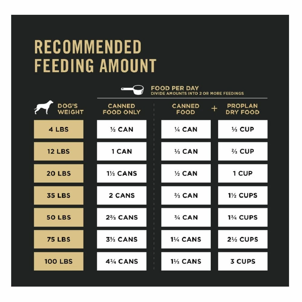 Divide amounts into 2 or more feedings. The exact amount your dog requires will vary according to age, activity and environment. Adjust as needed to maintain your dog in ideal body condition. Provide adequate fresh water in a clean container daily. For your pet’s health, see your veterinarian regularly.