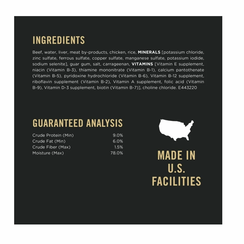 Beef, Water, Liver, Meat By-Products, Chicken, Rice, Minerals [Potassium Chloride, Zinc Sulfate, Ferrous Sulfate, Copper Sulfate, Manganese Sulfate, Potassium Iodide, Sodium Selenite], Guar Gum, Salt, Carrageenan, Vitamins [Vitamin E Supplement, Niacin (Vitamin B-3), Thiamine Mononitrate (Vitamin B-1), Calcium Pantothenate (Vitamin B-5), Pyridoxine Hydrochloride (Vitamin B-6), Vitamin B-12 Supplement, Riboflavin Supplement (Vitamin B-2), Vitamin A Supplement, Folic Acid (Vitamin B-9), Vitamin D-3 Supplement, Biotin (Vitamin B-7)], Choline Chloride. E443220.